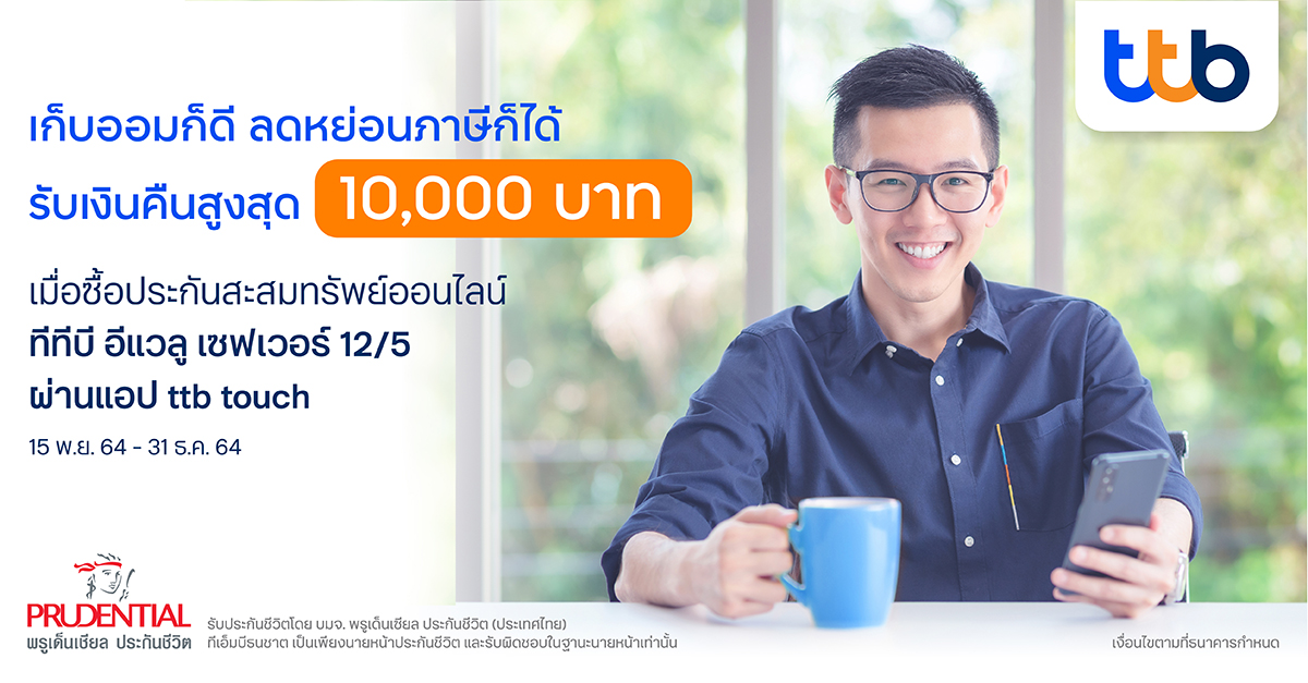 19 พฤศจิกายน 2564 : ทีเอ็มบีธนชาต หรือ ทีทีบี (ttb) ส่งเสริมให้คนไทยเลือกประกันที่พอดีกับชีวิต สร้างความคุ้มครองที่อุ่นใจ เพื่อนำไปสู่ชีวิตทางการเงินที่ดีขึ้นทั้งในวันนี้และอนาคต จับมือพันธมิตร บมจ.พรูเด็นเชียล ประกันชีวิต แนะนำประกันสะสมทรัพย์ออนไลน์ “ทีทีบี อีแวลู เซฟเวอร์ 12/5” ที่ให้ลูกค้าได้ประโยชน์ทั้งการเก็บออมเงินและความคุ้มครอง สามารถลดหย่อนภาษีได้สูงสุด 100,000 บาท โดยลูกค้าซื้อได้เองง่าย ๆ ผ่านแอปพลิเคชัน ทีทีบี ทัช (ttb touch)