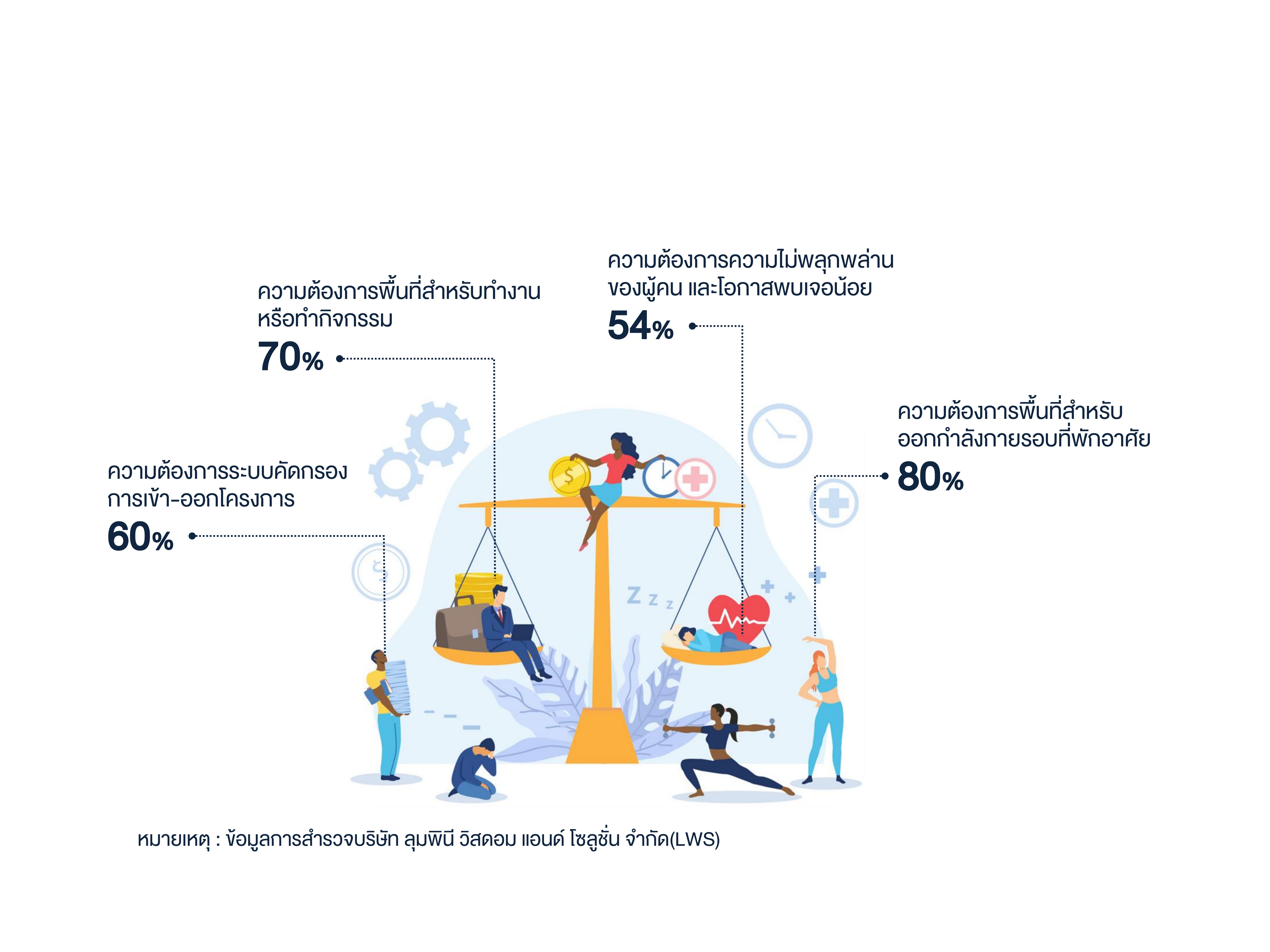 จากผลสำรวจของ “ลุมพินี วิสดอม” ข้างต้น ในด้านความเป็นส่วนตัวแล้วนั้น ตอบรับกับแนวคิด Rural Revival อย่างมาก โดยผู้อาศัยต้องการโครงการที่มีจำนวนห้องชุดต่อชั้นไม่มาก ไม่พลุกพล่าน ลดความแออัด มีความต้องการพื้นที่ Co-Living Space สำหรับทำงานในพื้นที่ส่วนกลางโดยสามารถเว้นระยะห่างกันเพื่อความปลอดภัยและความเป็นส่วนตัว อีกทั้งในยุคสมัยที่เวลาถูกใช้ให้เกิดประสิทธิภาพสูงสุด ไม่ว่าจะอยู่ที่ใดก็สามารถจัดการงานและภารกิจส่วนตัวได้