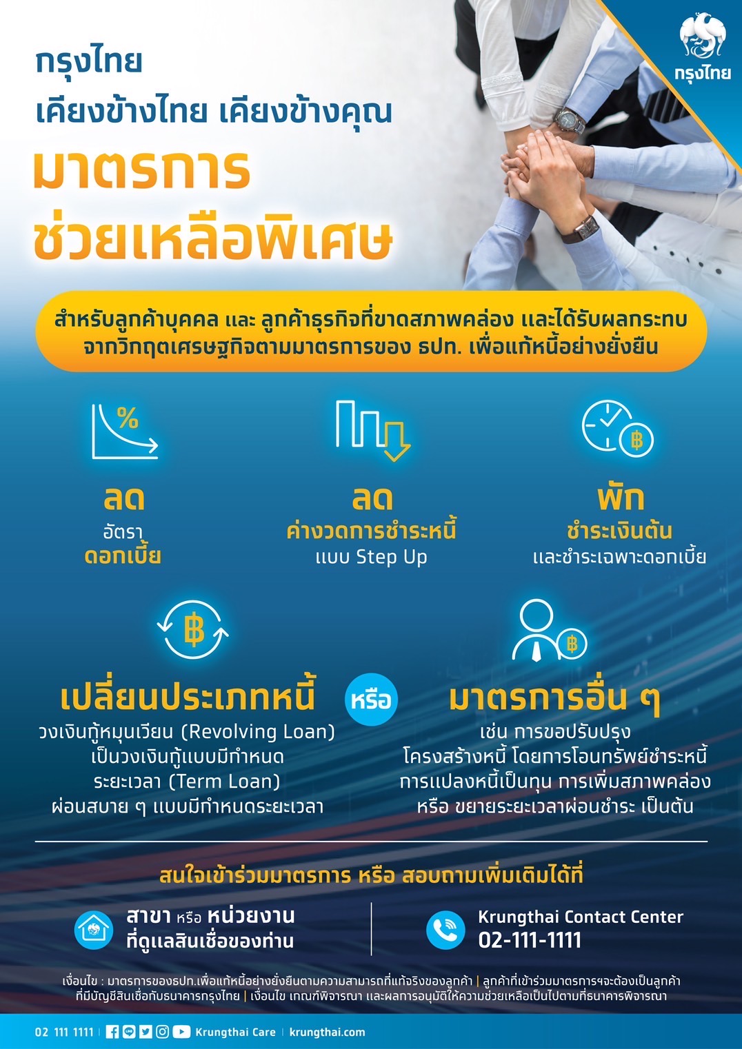 ทั้งนี้ การพิจารณาลูกค้าแต่ละรายเป็นไปตามหลักเกณฑ์ที่ธนาคารกำหนด โดยธนาคารจะเสนอแนวทางการปรับปรุงโครงสร้างหนี้ ที่เหมาะสมกับความสามารถในการชำระหนี้และความเสี่ยงของลูกค้า ลูกค้าที่สนใจเข้าร่วมมาตรการแก้หนี้อย่างยั่งยืน สอบถามรายละเอียดเพิ่มเติมได้ที่ ธนาคารกรุงไทย ทุกสาขาทั่วประเทศ หรือ Krungthai Contact Center 02 -1111111 และเว็บไซต์ https://krungthai.com/th/personal/loan/personal-loan/523 ![]()