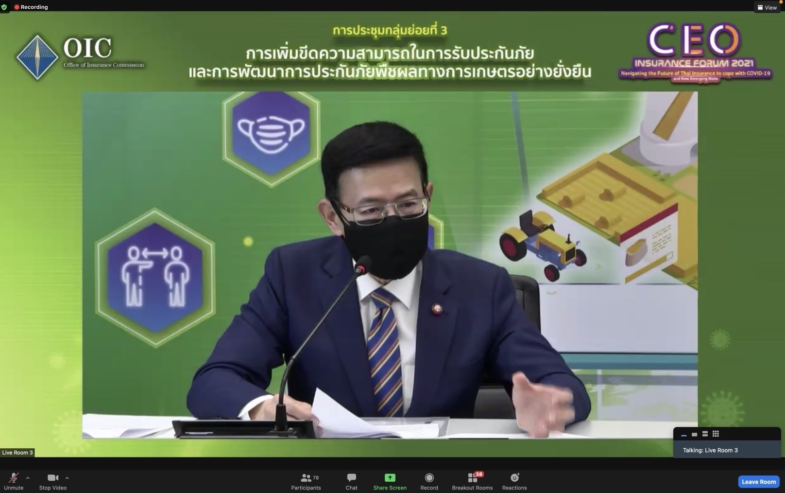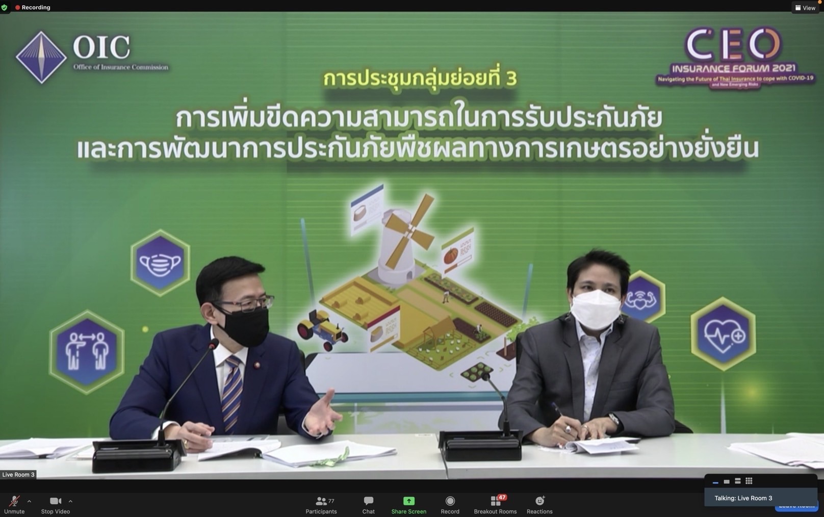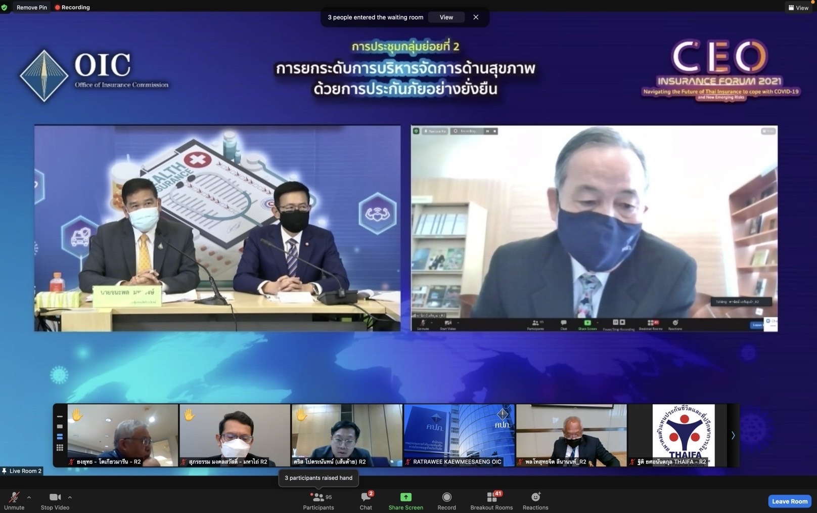 ภายใต้ Theme ของการประชุมคือ “Navigating the Future of Thai Insurance to cope with COVID-19 and New Emerging Risks” ในรูปแบบเสมือนจริง Virtual meeting ผ่านระบบ Zoom เพื่อเป็นเวทีสื่อสารทิศทางและนโยบายในการพัฒนาธุรกิจประกันภัยไทย แลกเปลี่ยนความรู้ ประสบการณ์ ข้อเสนอแนะ และข้อคิดเห็นที่เป็นประโยชน์ร่วมกันระหว่างสำนักงาน คปภ. ภาคธุรกิจประกันภัย และผู้เกี่ยวข้องอีกทั้ง เป็นการแสดงศักยภาพของการบูรณาการความร่วมมือในการพัฒนาธุรกิจประกันภัย