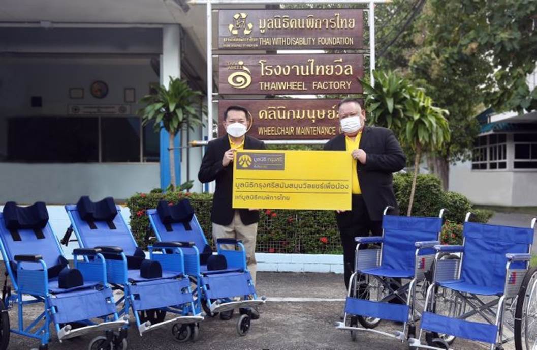กรุงเทพฯ 2 ธันวาคม 2564 : พูนสิทธิ์ ว่องธวัชชัย (ซ้าย) ผู้ช่วยเลขานุการมูลนิธิกรุงศรี มอบรถวีลแชร์สำหรับเยาวชนผู้พิการ เนื่องใน “วันคนพิการสากล” โดยมี ศุภชีพ ดิษเทศ (ขวา) ประธานมูลนิธิคนพิการไทย เป็นผู้รับมอบ เพื่อใช้อำนวยความสะดวกในการเดินทางแก่เยาวชนผู้พิการที่อยู่ในวัยเรียนให้ได้รับประโยชน์ในการดำรงชีวิตประจำวันมากยิ่งขึ้น การสนับสนุนครั้งนี้สะท้อนถึงความช่วยเหลือภาคสังคมและประชาชนในทุกมิติ ซึ่งเป็นหนึ่งในพันธกิจที่สำคัญของกรุงศรี งานดังกล่าวจัดขึ้น ณ สมาคมคนพิการแห่งประเทศไทย เมื่อเร็วๆ นี้ ![]()