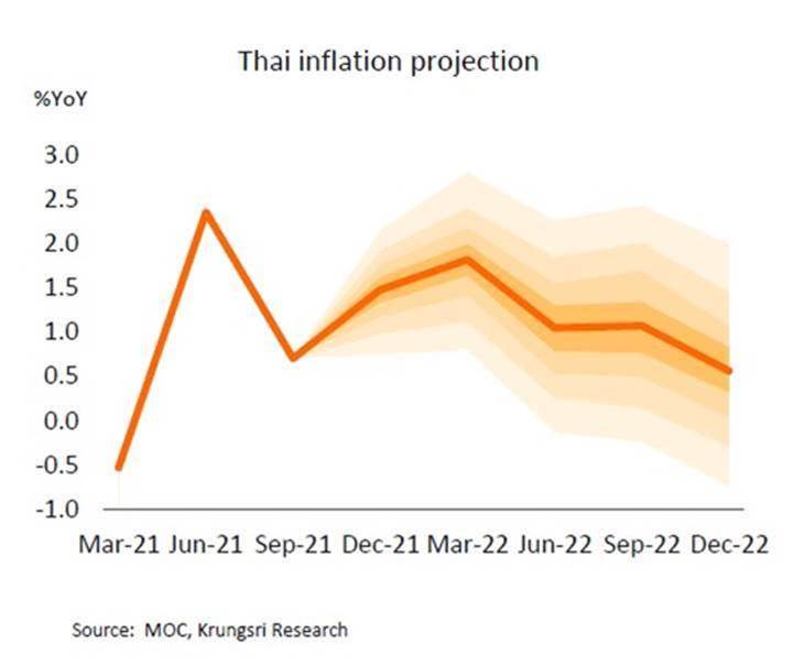 แม้อัตราเงินเฟ้อของไทยจะเร่งขึ้นในช่วงปลายปีนี้และมีแนวโน้มอาจแตะระดับสูงใกล้ 3% ในช่วงไตรมาส 1/2565 เนื่องจากผลของฐานที่ต่ำและการส่งผ่านของต้นทุน แต่คาดว่าจะชะลอลงและกลับมาแตะระดับใกล้ขอบล่างของกรอบเงินเฟ้อเป้าหมายของทางการที่ 1% ได้ในช่วงครึ่งหลังของปี 2565 ซึ่งสอดคล้องกับทิศทางราคาน้ำมันดิบในตลาดโลกที่มีแนวโน้มชะลอลง