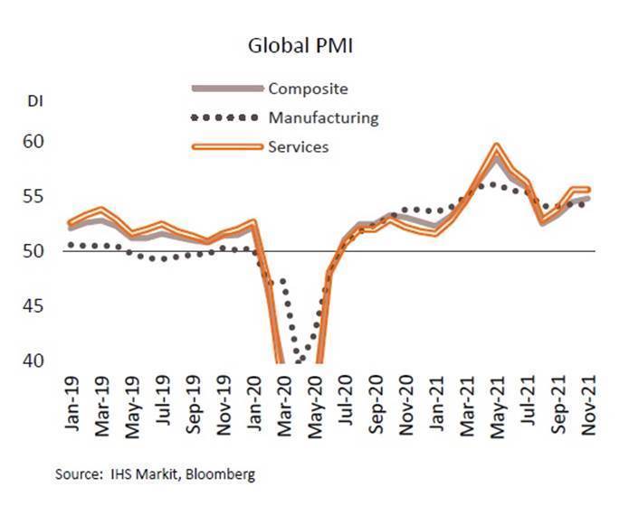 เศรษฐกิจสหรัฐฯมีแนวโน้มเติบโตแข็งแกร่ง คาดเฟดอาจเร่งปรับลด QE ให้เสร็จก่อนกลางปีหน้าเพื่อปูทางปรับขึ้นดอกเบี้ยช่วงครึ่งปีหลัง ในเดือนพฤศจิกายนดัชนีผู้จัดการฝ่ายจัดซื้อ (PMI) ปรับตัวดีขึ้นทั้งภาคการผลิตที่เพิ่มสู่ระดับ 61.1 สูงกว่าตลาดคาด และนอกภาคการผลิตซึ่งแตะระดับสูงสุดนับตั้งแต่เริ่มจัดทำข้อมูลในปี 2540 ที่ 69.1 ด้านการจ้างงานภาคเอกชนเพิ่มขึ้น 5.34 แสนตำแหน่ง สูงกว่าการคาดการณ์ของนักวิเคราะห์ ขณะที่อัตราการว่างงานแตะระดับต่ำสุดนับตั้งแต่เดือนกุมภาพันธ์ 2563 ที่ 4.2%