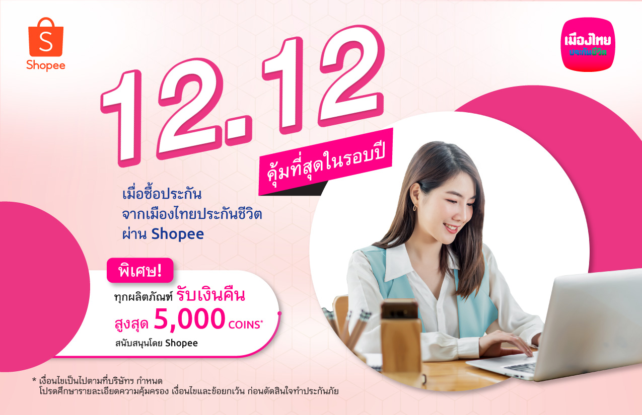 ล่าสุด เมืองไทยประกันชีวิต ร่วมกับ ช้อปปี้ (Shopee) ผู้นำแพลตฟอร์มอีคอมเมิร์ซในภูมิภาคเอเชียตะวันออกเฉียงใต้และไต้หวัน จัดแคมเปญใหญ่ส่งท้ายปี ต้อนรับมหกรรม “Shopee 12.12 Birthday Sale” เพื่อตอบโจทย์ผู้ที่กำลังวางแผนด้านภาษี รวมถึงการวางแผนด้านการออมผ่านผลิตภัณฑ์ประกันชีวิต พร้อมรับโปรโมชันพิเศษ เพียงเลือกซื้อแบบประกันภัยที่ร่วมรายการจากเมืองไทยประกันชีวิตผ่านร้าน “Muang Thai Life Official” บน Shopee Mall รับเงินคืน (Coin Cashback) สูงสุด 5,000 Coins ทุกคำสั่งซื้อ โปรโมชันเริ่มแล้วตั้งแต่วันนี้ – 29 ธันวาคม 2564