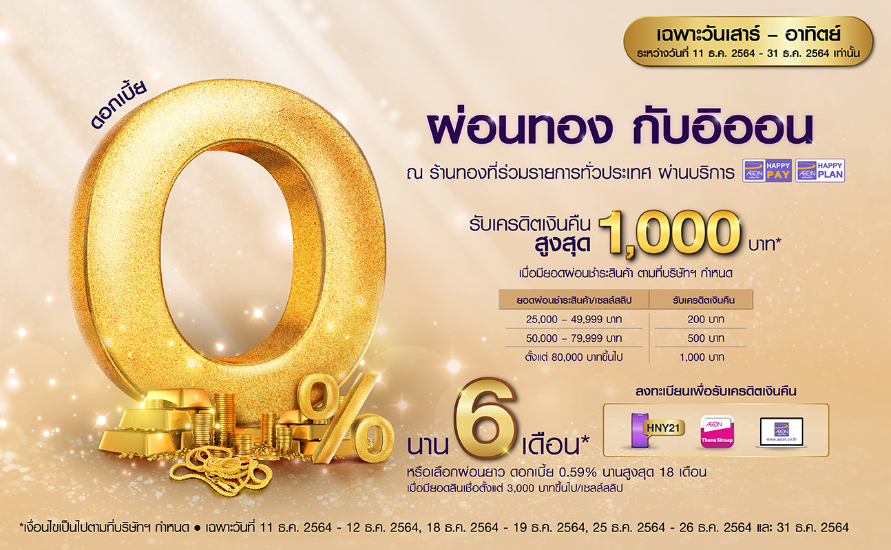 กรุงเทพฯ, 13 ธันวาคม 2564 : บริษัท อิออน ธนสินทรัพย์ (ไทยแลนด์) จำกัด (มหาชน) จัดโปรฉลองต้อนรับปีใหม่ให้ลูกค้าซื้อของขวัญชิ้นสำคัญ กับแคมเปญ “ผ่อนทอง กับอิออน” แบบสบาย ๆ พร้อมรับอัตราดอกเบี้ยสุดพิเศษ 0% นานถึง 6 เดือน หรือเลือกผ่อนนานสูงสุด 18 เดือนกับอัตราดอกเบี้ยต่ำเพียง 0.59% ต่อเดือน พร้อมรับเครดิตเงินคืนสูงสุดถึง 1,000 บาท เมื่อมียอดชำระตามที่กำหนด ผ่านโปรแกรม “อิออน แฮปปี้ เพย์ หรือ อิออน แฮปปี้ แพลน”[1]
