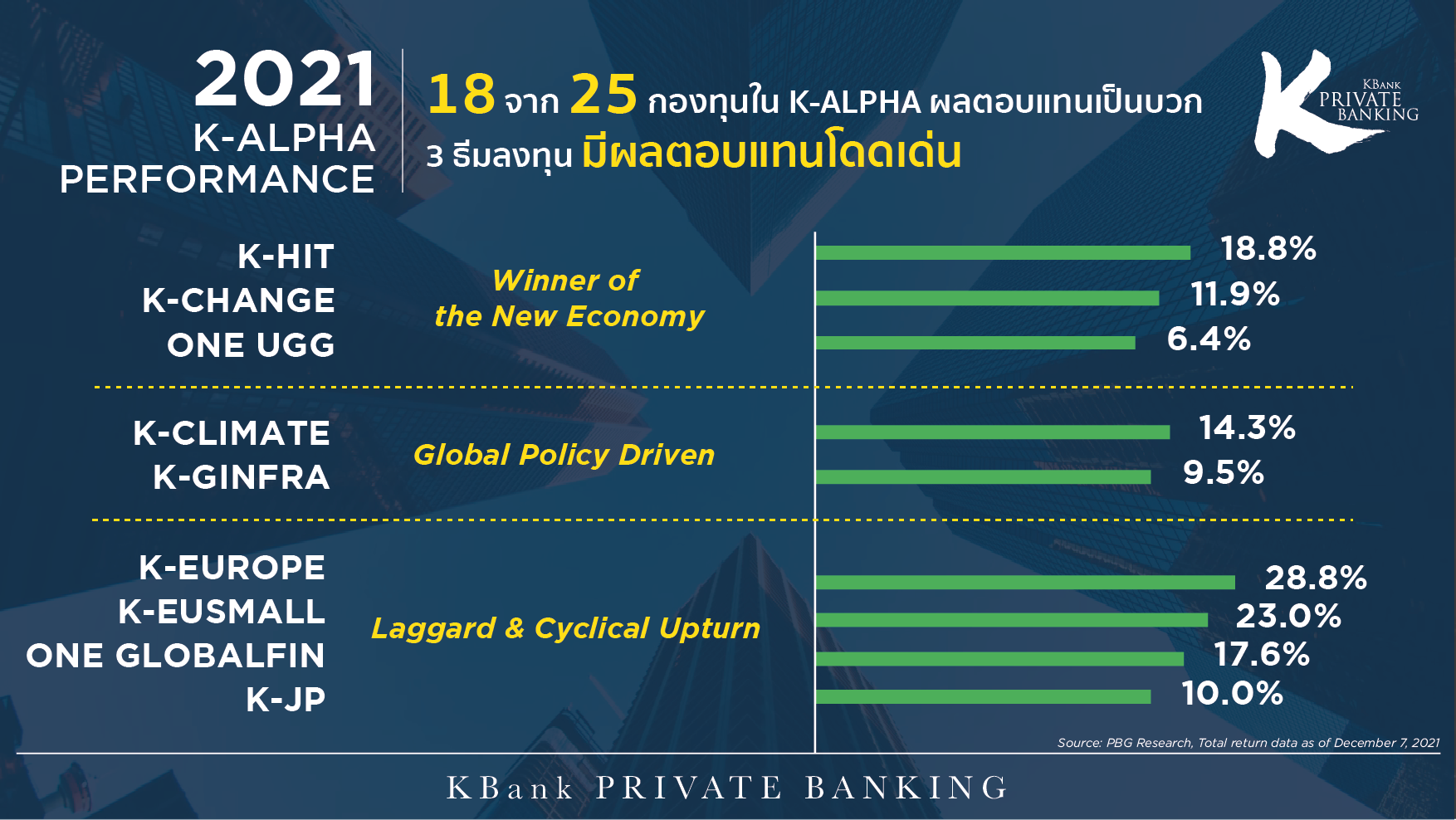 - Policy Driven for Better World (ธุรกิจที่มีนโยบายขับเคลื่อนเพื่อโลกที่ดีกว่า) เช่น กองทุน K-CLIMATE (+14.3%)** ลงทุนในธุรกิจที่เกี่ยวข้องกับการช่วยลดปัญหาการเปลี่ยนแปลงสภาพภูมิอากาศ และ กองทุน K-GINFRA (+9.5%)**ลงทุนในภาคอุตสาหกรรมโครงสร้างพื้นฐานในสหรัฐฯ ที่ได้รับอานิสงค์จากแผนการพัฒนาโครงสร้างครั้งใหญ่ของประธานาธิบดีไบเดน