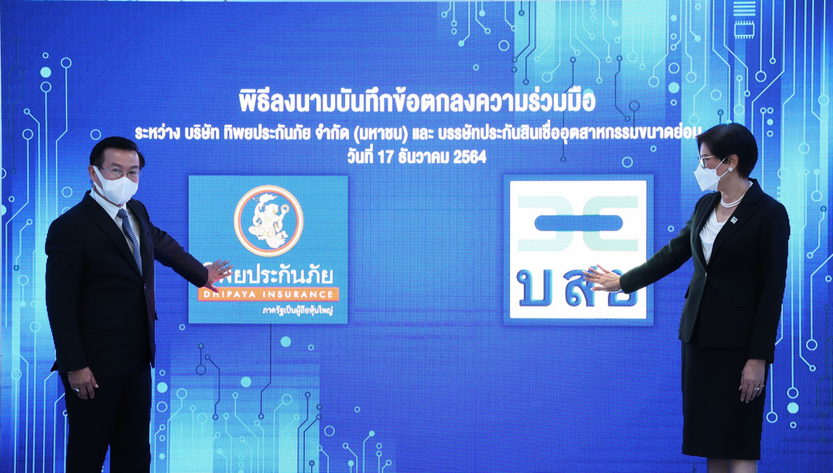 17 ธันวาคม 2564 : ดร.สมพร สืบถวิลกุล ประธานเจ้าหน้าที่บริหาร บริษัท ทิพย กรุ๊ป โฮลดิ้งส์ จำกัด(มหาชน) และ กรรมการผู้จัดการใหญ่ บริษัท ทิพยประกันภัย จำกัด (มหาชน) ร่วมลงนามบันทึกข้อตกลงความร่วมมือ(MOU) โครงการ บสย.ผนึกกำลัง บมจ.ทิพยประกันภัย ผลักดัน SMEs ไทยมุ่งสู่ความมั่นคงทางธุรกิจ กับ คุณวสุกานต์ วิศาลสวัสดิ์ รักษาการผู้จัดการทั่วไป บรรษัทประกันสินเชื่ออุตสาหกรรมขนาดย่อม (บสย.) เพื่อช่วยเหลือและส่งเสริมผู้ประกอบการขนาดกลางและขนาดย่อม (SMEs)