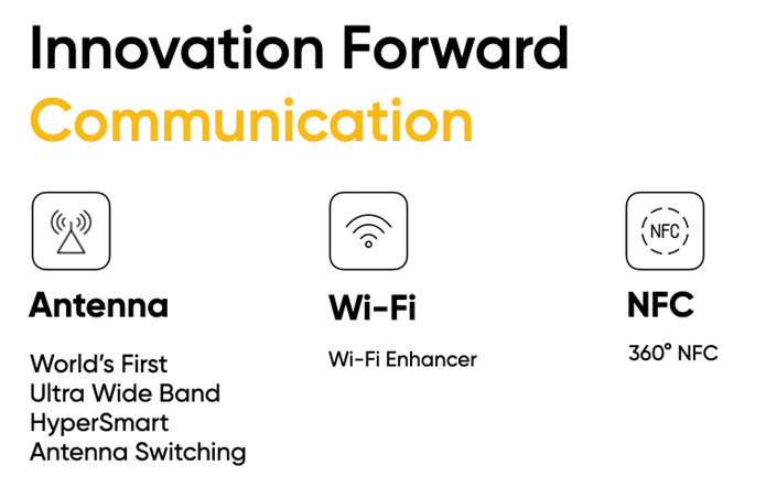realme GT 2 Pro ติดตั้งระบบเสาสัญญาณแบบ Antenna Array Matrix System ที่ผสาน 3 สุดยอดเทคโนโลยีการสื่อสารในหนึ่งเดียว: เทคโนโลยีสลับเสาสัญญาณคลื่นย่านอัลตร้าไวด์แบนด์ (HyperSmart) ครั้งแรกของโลก ระบบเพิ่มประสิทธิภาพการจับสัญญาณ Wi-Fi และเทคโนโลยี 360° Near-Field Communication (NFC)