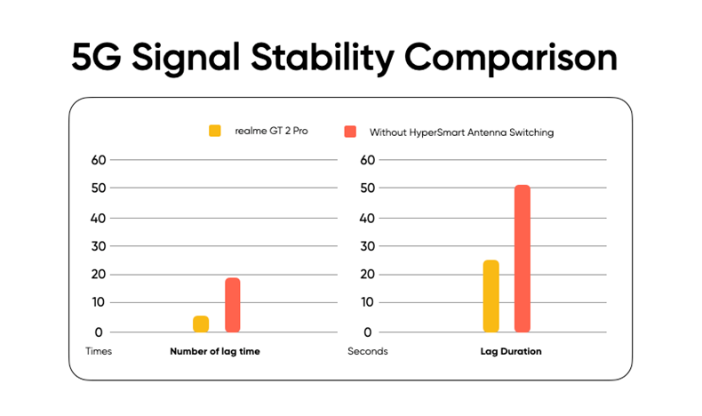 เทคโนโลยีสลับเสาสัญญาณคลื่นย่านอัลตร้าไวด์แบนด์ (HyperSmart) ของ realme ถูกออกแบบให้มีเสาอากาศมากถึง 12 จุด โดยติดตั้งทุกด้านรอบตัวเครื่อง รองรับย่านสัญญาณหลักได้รอบทิศทางและมีประสิทธิภาพการรองรับความแรงของสัญญาณได้เท่ากันทุกจุด ซึ่งทำให้ realme GT 2 Pro สามารถประเมินความแรงสัญญาณของเสาสัญญาณแต่ละจุดได้แบบอัจฉริยะ และทำการเลือกใช้เสาสัญญาณที่มีความแรงสัญญาณสูงสุดได้อัตโนมัติ