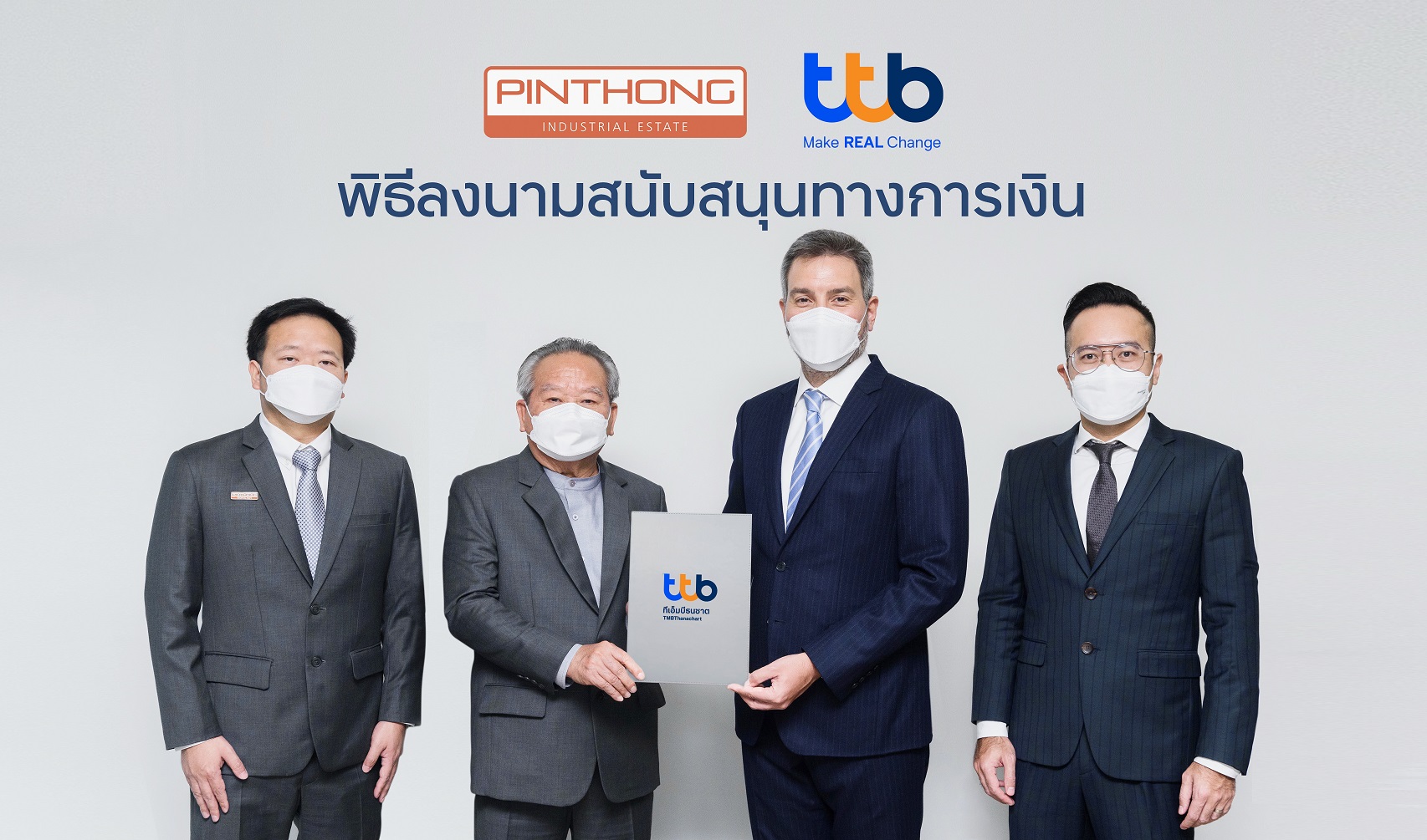 22 ธันวาคม 2564 : อเล็กซานเดอร์ นนท์ แลงเฟลด์ หัวหน้าเจ้าหน้าที่บริหาร บริหารความสัมพันธ์ธุรกิจ ทีเอ็มบีธนชาต หรือ ทีทีบี (ttb) (ที่ 3 จากซ้าย) ร่วมลงนามในสัญญาสนับสนุนวงเงินสินเชื่อเพื่อความยั่งยืน จำนวน 1,100 ล้านบาท ให้แก่ พีระ ปัทมวรกุลชัย ประธานเจ้าหน้าที่บริหาร บริษัท ปิ่นทอง อินดัสเตรียล ปาร์ค จำกัด (มหาชน) (ที่ 2 จากซ้าย) ผู้ดำเนินธุรกิจพัฒนาและบริหารจัดการนิคมอุตสาหกรรม