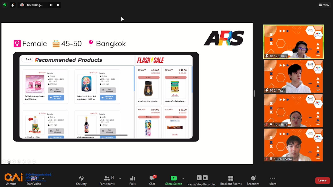 น้องเติม-นิพิฐพนธ์ ตุงคะรักษ์ นักเรียนชั้นมัธยมศึกษาปีที่ 5 โรงเรียนสาธิต มศว ปทุมวัน สมาชิกทีม ARS และสมาชิกค่ายสาย Business AI เล่าว่า ปัจจุบัน สินค้าบนช่องทาง All Online ของซีพี ออลล์ มีมากกว่า 60,000 รายการ มากกว่าจำนวนสินค้าที่วางจำหน่ายในร้านเซเว่น อีเลฟเว่นแต่ละสาขา และยังมีแนวโน้มเพิ่มจำนวนขึ้นอย่างต่อเนื่อง สิ่งที่เกิดขึ้นคือ พนักงานหน้าร้านอาจแนะนำสินค้าจากประสบการณ์ส่วนตัวเป็นหลัก