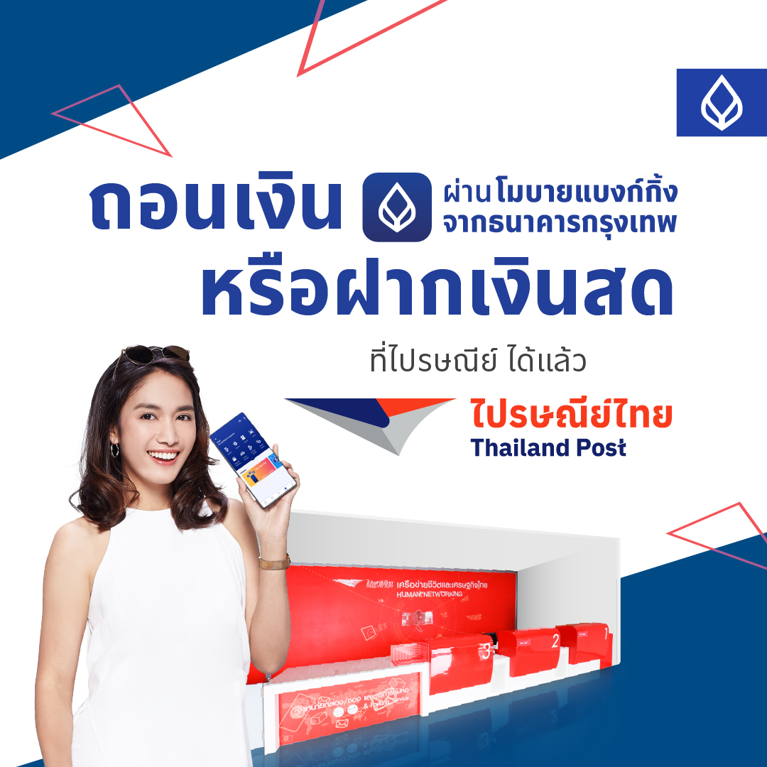 ลูกค้าที่มีบัญชีสะสมทรัพย์ และบัญชีกระแสรายวัน ธนาคารกรุงเทพ สามารถถอนเงินผ่านโมบายแบงก์กิ้ง จากธนาคารกรุงเทพ โดยเลือกเมนู ‘ถอนเงินผ่านตัวแทน’ และเลือกตัวแทน ‘Thailand Post’ และระบุบัญชีและจำนวนเงินที่ต้องการถอน พร้อมกดยืนยัน ระบบจะสร้าง QR Code สำหรับทำรายการถอนเงิน (รายการมีอายุ 60 นาที) ลูกค้าแสดงบัตรประชาชนแบบสมาร์ทการ์ด และแสดง QR Code ให้พนักงานไปรษณีย์สแกน