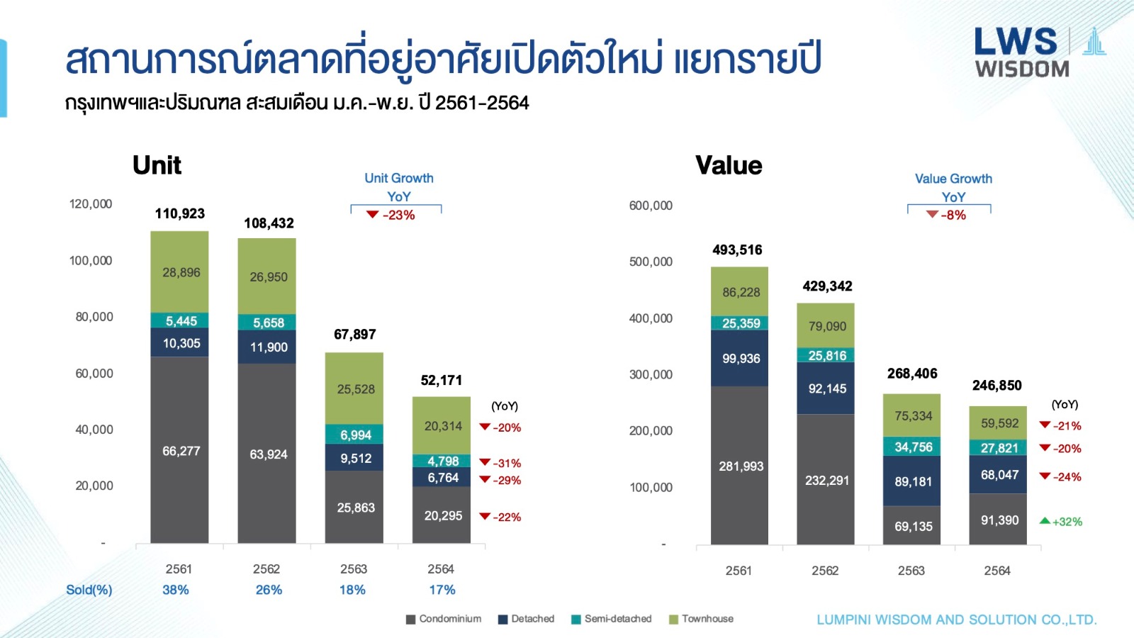 คาดว่าจะมีหน่วยเปิดตัวใหม่ในปี 2564 ประมาณ 20,000-22,000 หน่วย คิดเป็นมูลค่า 99,000-112,000 ล้านบาท ลดลงจากปี 2564 16%-23% โดยตัวเลขการเปิดตัวโครงการใหม่ในเขตกรุงเทพฯ-ปริมณฑล ในเดือน มกราคม-พฤศจิกายน 2564 มีจำนวน 52,171 หน่วย ลดลง 23% เมื่อเทียบกับระยะเดียวกันของปี 2563 เป็นการเปิดตัวโครงการคอนโดมิเนียม 20,295 หน่วย มีอัตราการขายเฉลี่ยอยู่ที่ 23% และการเปิดตัวโครงการแนวราบ 31,876 หน่วย อัตราการขายเฉลี่ยอยู่ที่ 13%