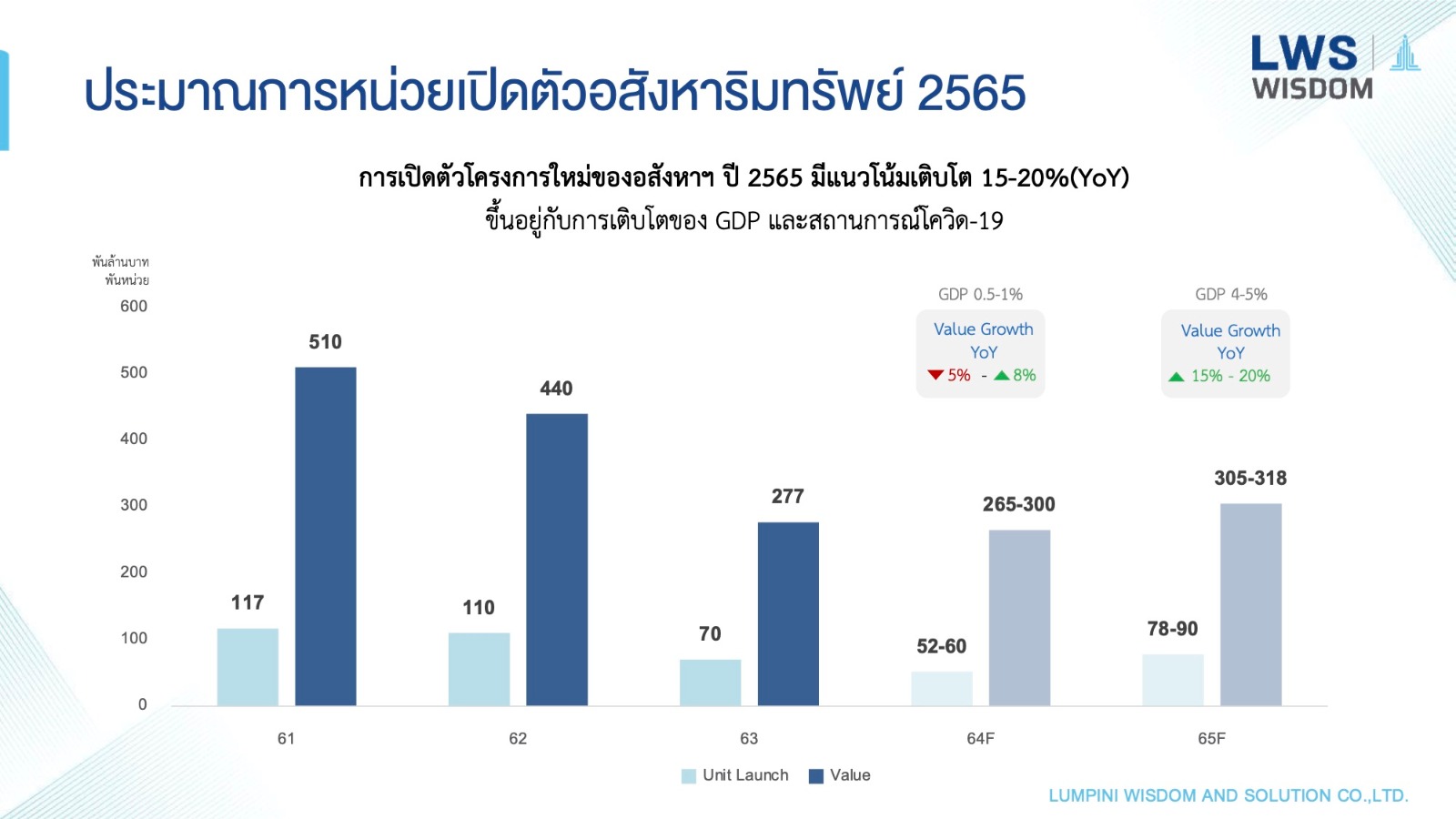 27 ธันวาคม 2564 : นายประพันธ์ศักดิ์ รักษ์ไชยวรรณ กรรมการผู้จัดการ บริษัท ลุมพินี วิสดอม แอนด์ โซลูชั่น จำกัด (LPN Wisdom หรือ LWS) บริษัทวิจัยและที่ปรึกษาในการพัฒนาอสังหาริมทรัพย์ในเครือบริษัท แอล.พี.เอ็น.ดีเวลลอปเมนท์ จำกัด (มหาชน) (LPN) กล่าวถึงแนวโน้มตลาดอสังหาริมทรัพย์ในปี 2565 ว่า ตลาดอสังหาริมทรัพย์ในปี 2565 มีแนวโน้มที่จะเติบโตประมาณ 15-20% ตามการคาดการณ์แนวโน้มเศรษฐกิจที่คาดว่าจะเติบโตประมาณ 3.5-4% ของธนาคารแห่งประเทศไทย(ธปท.) และสำนักงานสภาพัฒนาการเศรษฐกิจและสังคมแห่งชาติ(สภาพัฒน์)