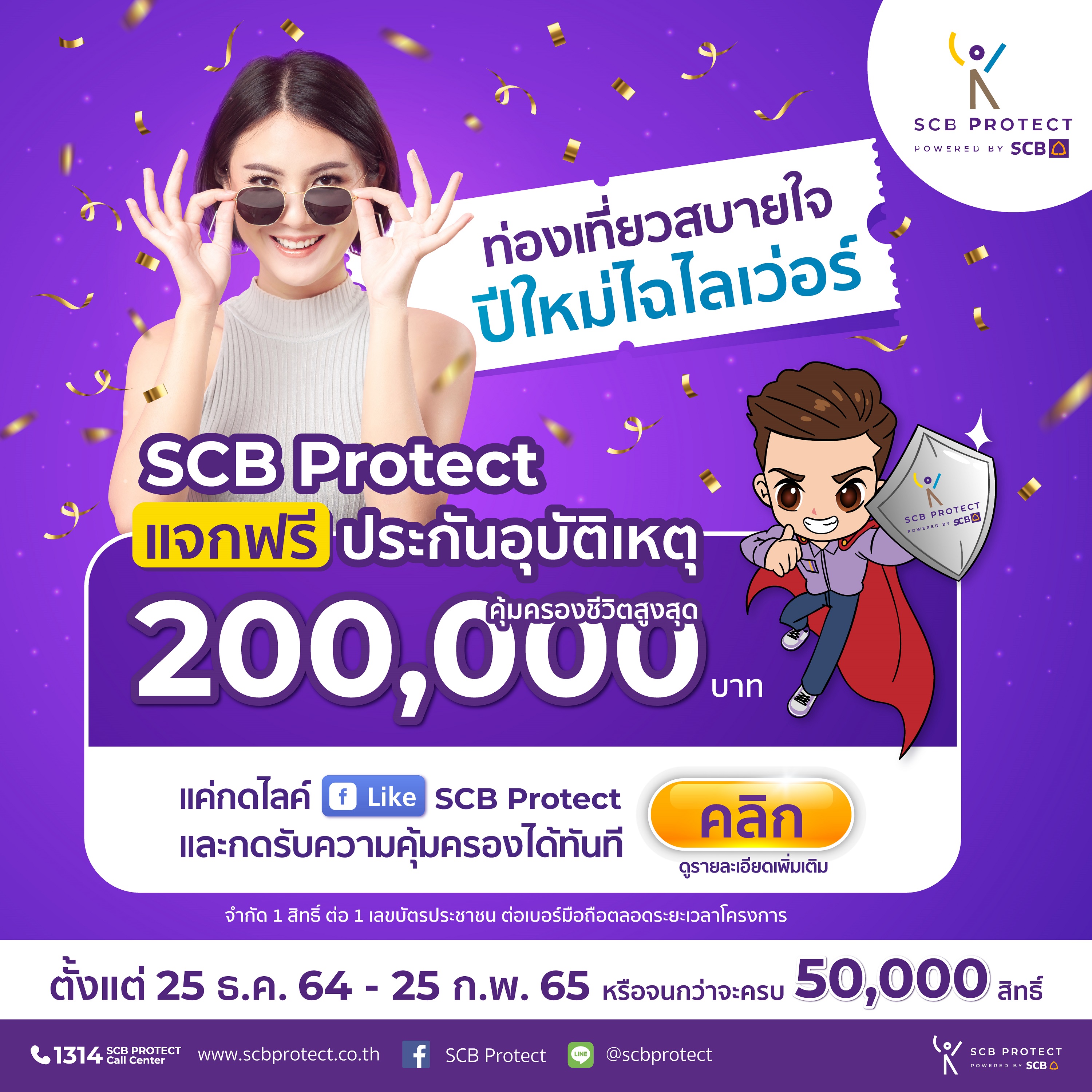 ผู้สนใจ สามารถรับประกันอุบัติเหตุได้ง่ายๆ เพียงกดไลค์เพจ SCB Protect และสามารถกดรับความคุ้มครองได้ทันที หรือ สามารถคลิกลงทะเบียนได้ที่ https://scbprotect.scb/FreeNY22 จนกว่าจะครบ 50,000 สิทธิ์ และสามารถรับสิทธิ์ได้ผ่านกลุ่มธุรกิจของธนาคารไทยพาณิชย์และพันธมิตร อีก 150,000 สิทธิ์ โดยจำกัด 1 สิทธิ์ ต่อ 1 เลขบัตรประชาชน ต่อเบอร์มือถือตลอดระยะเวลาโครงการ ![]()
