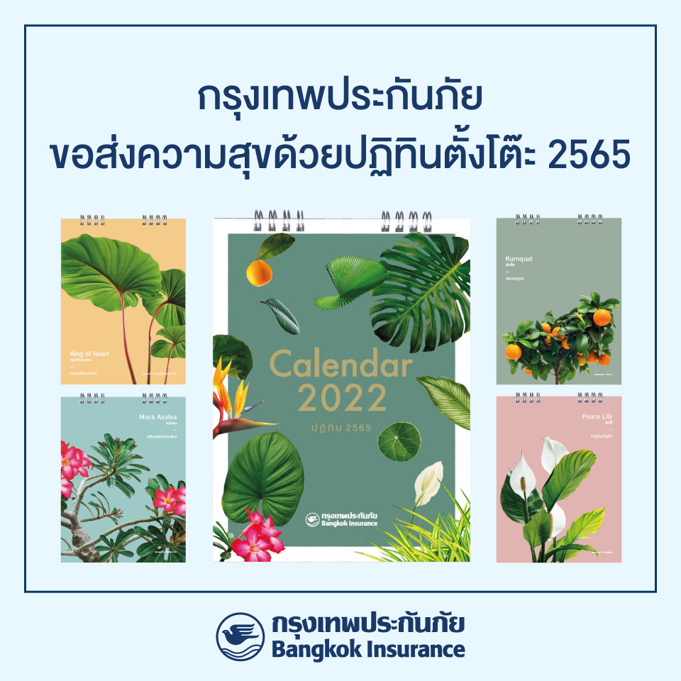 30 ธันวาคม 2564 : บริษัท กรุงเทพประกันภัย จำกัด (มหาชน) หรือ BKI ขอร่วมส่งความสุขด้วยปฏิทินตั้งโต๊ะ ชวนผ่อนคลายด้วยสีสันของธรรมชาติ โดยนำเสนอเรื่องราวของพรรณไม้มงคล 12 ชนิด ที่มาพร้อมความหมายอันเป็นมงคล เพื่อมอบเป็นของขวัญแทนคำขอบคุณแด่ลูกค้า คู่ค้าที่ให้การสนับสนุนกิจการของบริษัทฯ ด้วยดีเสมอมา และในโอกาสปีใหม่ที่ใกล้จะถึงนี้ กรุงเทพประกันภัยขอให้ทุกท่านประสบความสุขทั้งกายและใจสุขภาพแข็งแรงปราศจากโรคภัย ![]()
