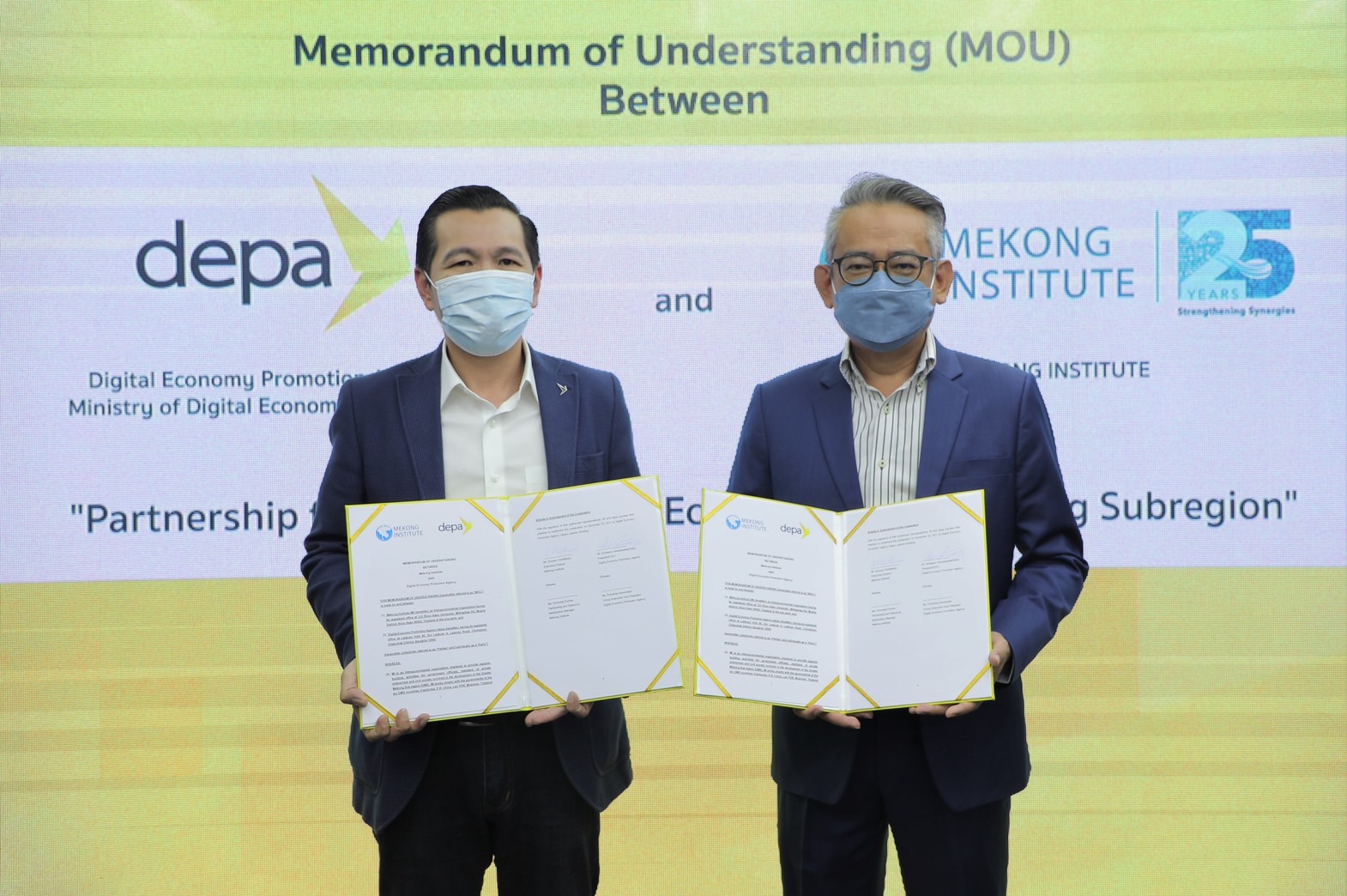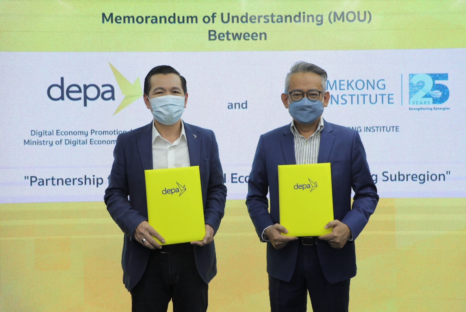 29 ธันวาคม 2564 : ดร.ณัฐพล นิมมานพัชรินทร์ ผู้อำนวยการใหญ่ สำนักงานส่งเสริมเศรษฐกิจดิจิทัล (depa) พร้อมด้วย นายสุริยัน วิจิตรเลขการ ผู้อำนวยการบริหาร สถาบันความร่วมมือเพื่อพัฒนาเศรษฐกิจลุ่มน้ำโขง (Mekong Institute : MI) ร่วมลงนามความร่วมมือบันทึกความเข้าใจ (MOU) เพื่อส่งเสริมและสนับสนุนเทคโนโลยีนวัตกรรมดิจิทัล มุ่งยกระดับเศรษฐกิจและสังคม ภายใต้โครงการพัฒนาความร่วมมือทางเศรษฐกิจในอนุภูมิภาคลุ่มแม่น้ำโขง (Greater Mekong Sub-region, GMS)