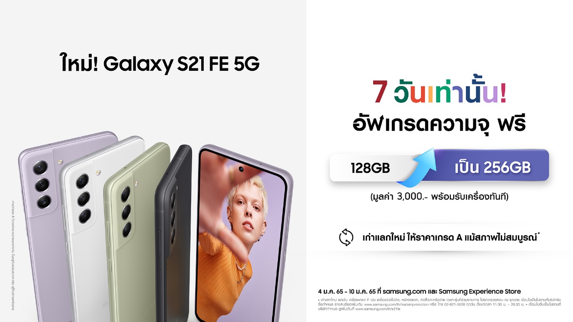 โปรโมชั่นสุดคุ้ม! สำหรับผู้ที่สั่งซื้อในรอบวางจำหน่ายพิเศษตั้งแต่วันที่ 4 – 10 มกราคม 2565 สามารถอัพเกรดความจุจาก 128GB เป็น 256GB ได้ฟรี! มูลค่า 3,000 บาท พร้อมรับเครื่องได้ทันที และยังจะได้รับส่วนลดเพิ่มเติมจากโปรโมชั่นเก่าแลกใหม่อีกด้วย ที่ Samsung Experience Store และ samsung.com คลิกเข้าไปดูรายละเอียดได้แล้ววันนี้ที่ https://www.samsung.com/th/smartphones/galaxy-s21-5g/galaxy-s21-fe-5g/buy/ ![]()
