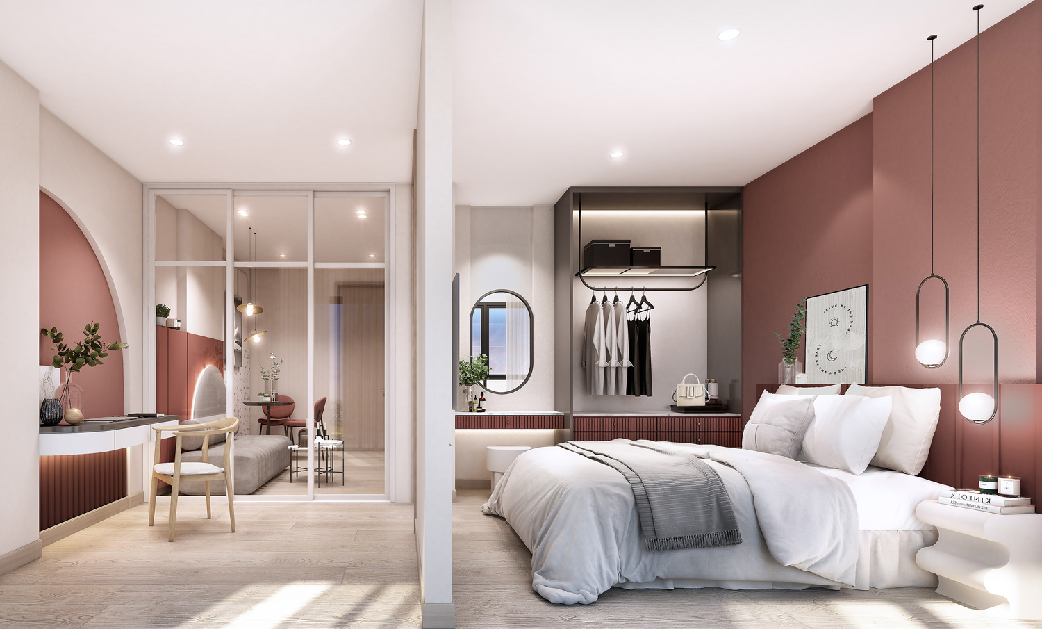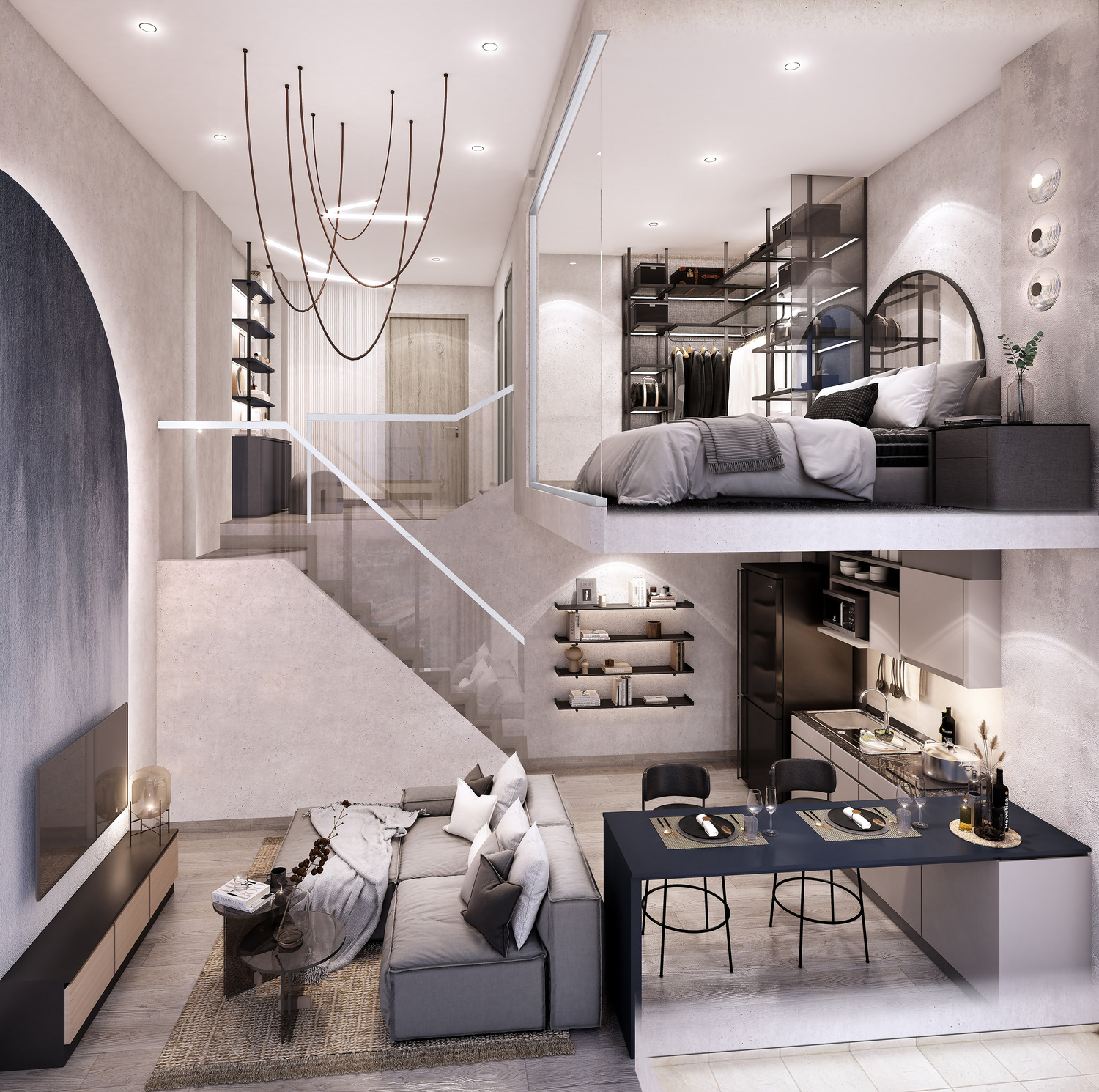 โดยเน้นเส้นสายแนวตั้งที่ดูมั่นคง เป็นองค์ประกอบหลักของเส้นสายอาคารและไล่เฉดสีจากโทนสีเข้มไปจนถึงโทนสีอ่อนซึ่งให้ความรู้สึกเสมือนระดับพื้นดิน หรือชั้นหินค่อย ๆไล่ระดับสีสูงขึ้นเป็นชั้นเหนือพื้นดิน จนถึงชั้นบนสุดของอาคารโดยใช้โทนสีอ่อนเปรียบเสมือนท้องฟ้า และก้อนเมฆ ในบรรยากาศ Loftที่มีประตู หน้าต่าง ฝ้าเพดานสูงโปร่ง โดยมีรูปแบบห้องที่หลากหลายในราคาเริ่มต้นเพียง 1.7 ล้านบาท เริ่มจากห้อง Studio ขนาด 28.0 ตร.ม.จนถึงห้องใหญ่สุด 2 Bedrooms ขนาด 64.5 ตร.ม.