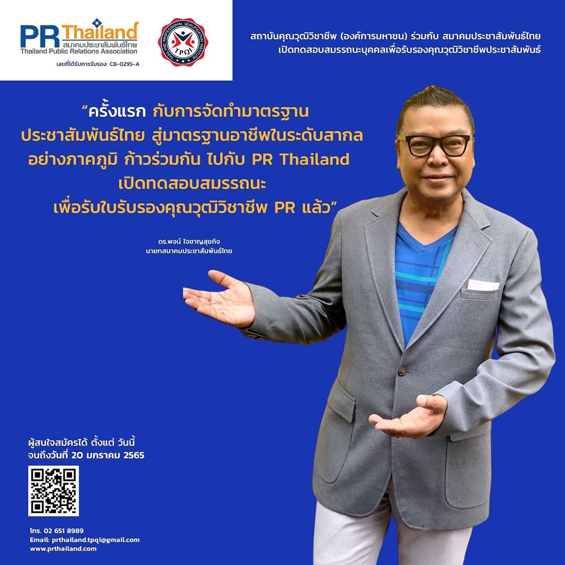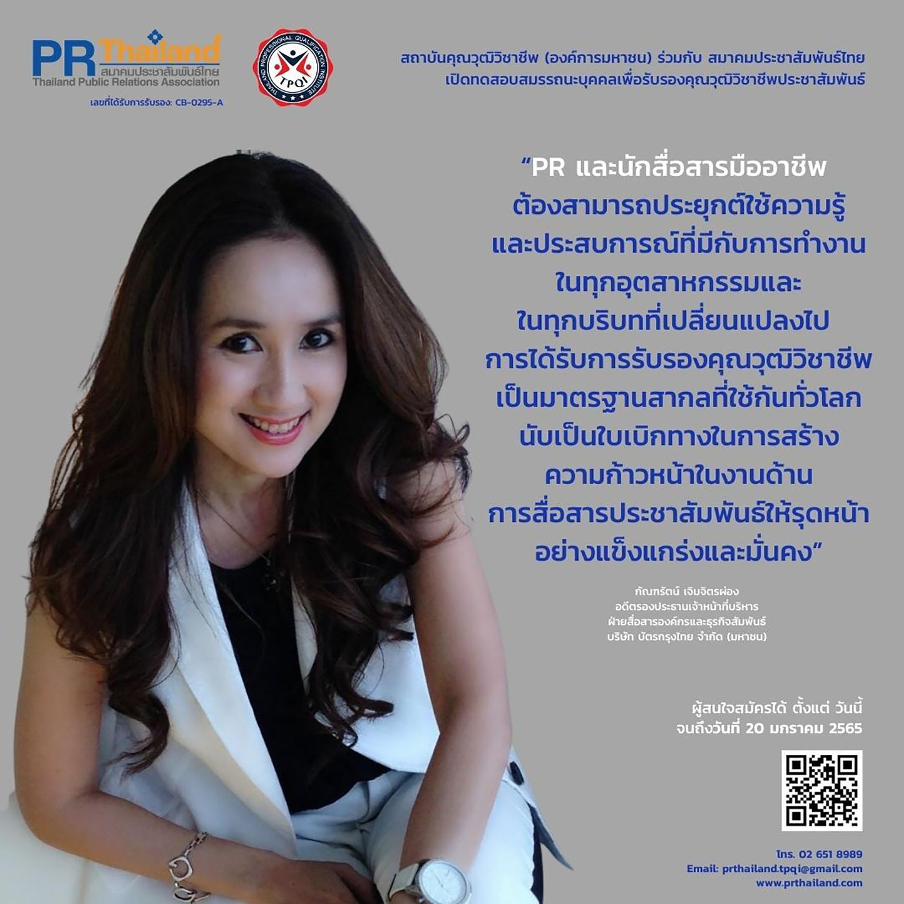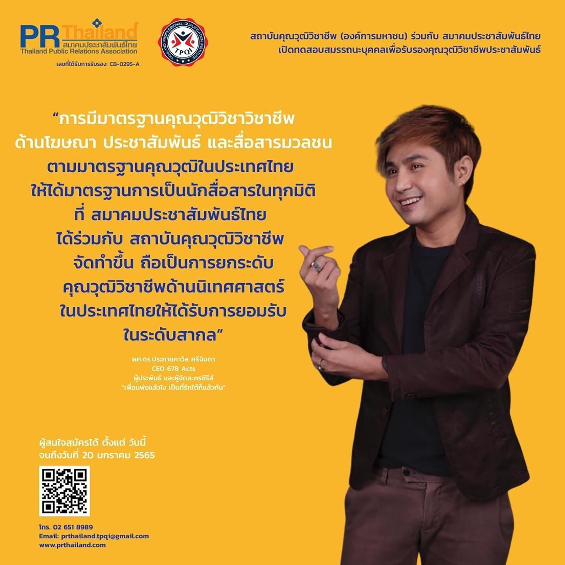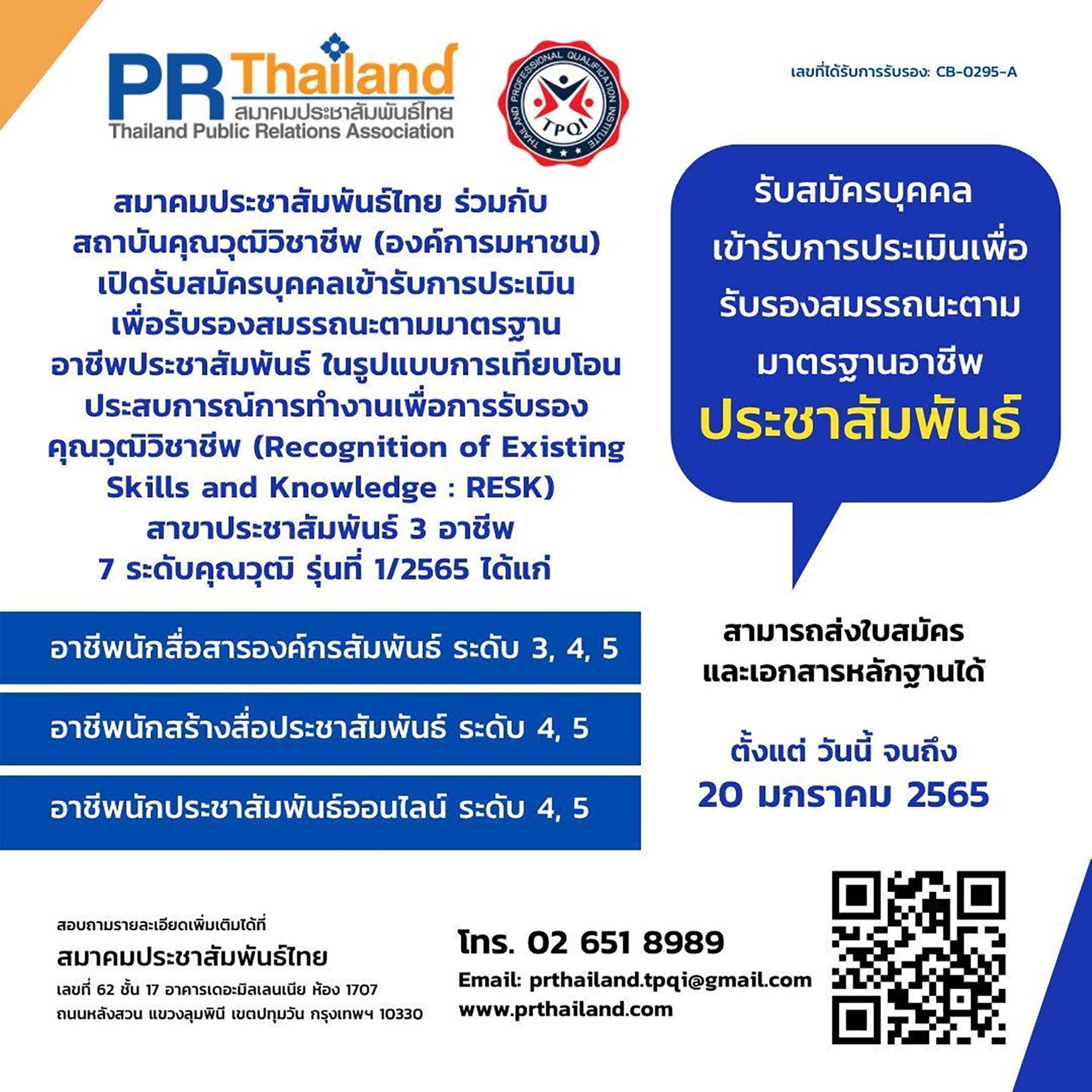 ติดตามข้อมูลเพิ่มเติม หรือสอบถามรายละเอียดได้ที่ สมาคมประชาสัมพันธ์ไทย เลขที่ 62 ชั้น 17 อาคารเดอะมิลเลนเนีย ห้อง 1707 ถนนหลังสวน แขวงลุมพินี เขตปทุมวัน กรุงเทพฯ 10330 โทร. 02 651 8989อีเมล์: prthailand.tpqi@gmail.com, www.prthailand.com ![]()
