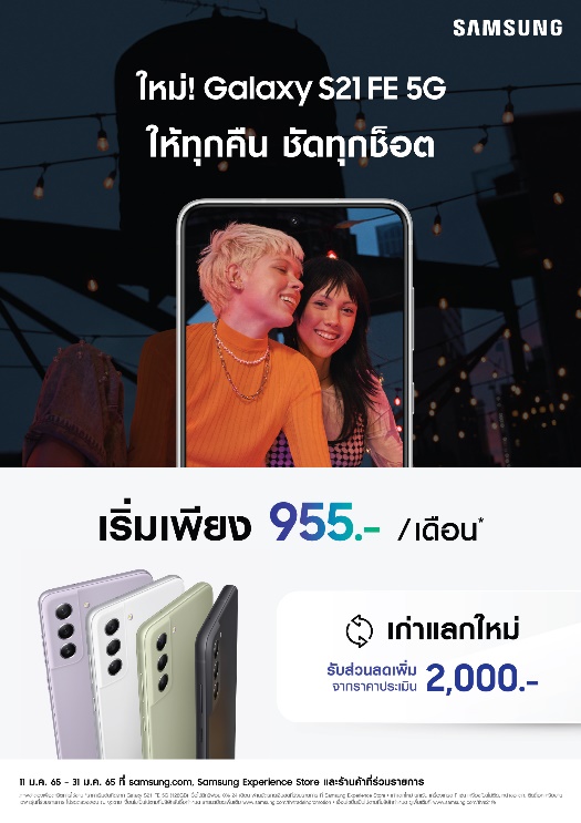 ข้อเสนอพิเศษ! กับราคาเริ่มต้นเพียง 955 บาทต่อเดือน รับสิทธิ์ผ่อน 0% นาน 24 เดือนเมื่อชำระด้วยบัตรกดเงินสดที่ร่วมรายการ พร้อมรับส่วนลดเพิ่ม 2,000 บาท จากโปรโมชั่นเก่าแลกใหม่ สามารถดูรายละเอียดเพิ่มเติมได้ทาง https://www.samsung.com/th/smartphones/galaxy-s21-5g/galaxy-s21-fe-5g/buy/ ![]()