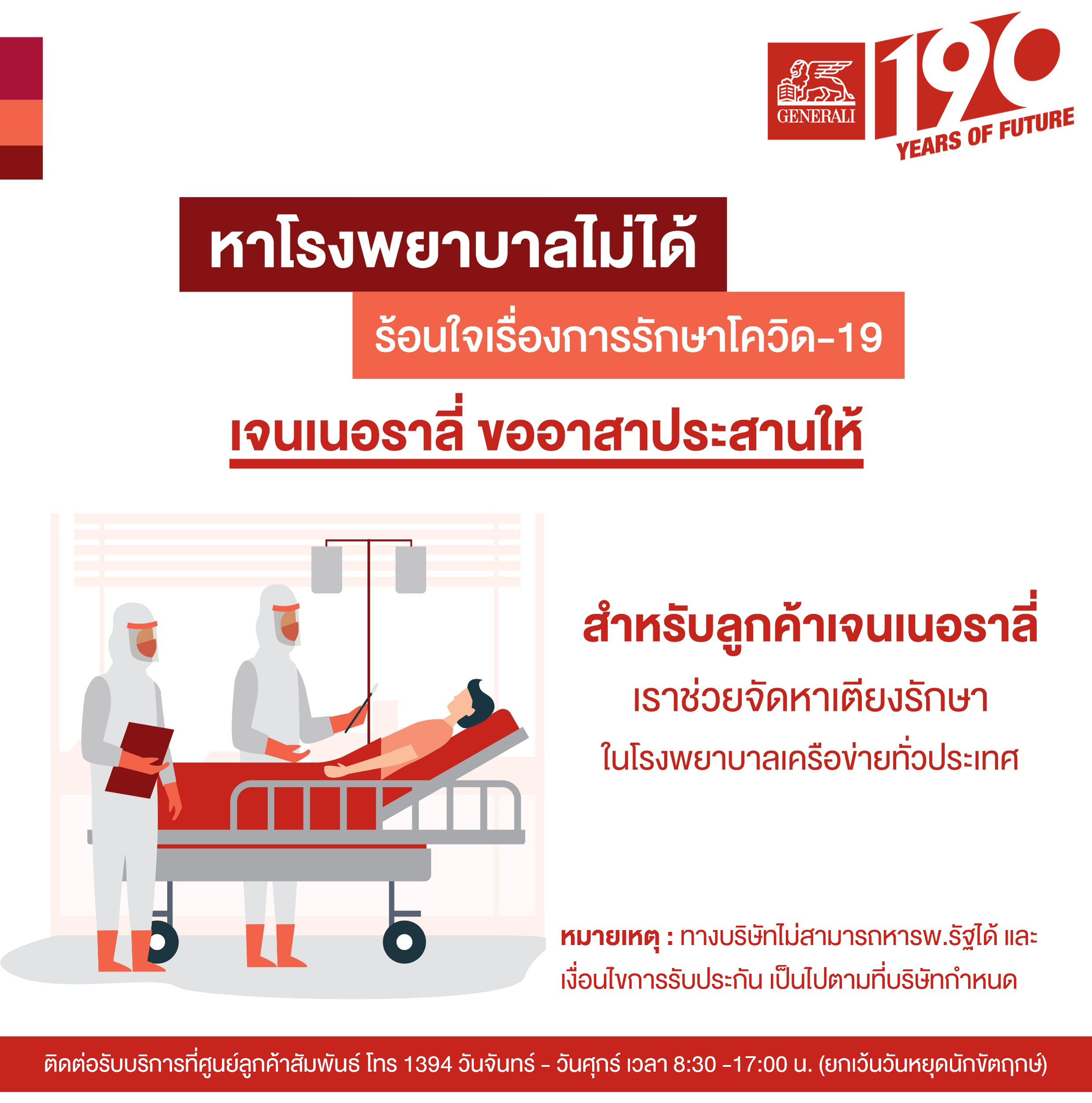 นอกจากนี้ ยังมีบริการพิเศษ FIND HOSPITAL by Generali เพื่อช่วยเหลือลูกค้าของเจนเนอราลี่ที่ติดเชื้อโควิด-19 ในการประสานช่วยหาโรงพยาบาลเพื่อจัดส่งตัวเข้าสู่ระบบการรักษาในโรงพยาบาล โดยทางบริษัทฯ จะดำเนินการประสานกับโรงพยาบาลเอกชนในเครือข่ายที่มีทั่วประเทศ ลูกค้าสามารถติดต่อผ่านศูนย์ลูกค้าสัมพันธ์ 1394 วันจันทร์ - วันศุกร์ เวลา 8:30 -17:00 น. (ยกเว้นวันหยุดนักขัตฤกษ์)ทั้งนี้ ความคุ้มครองค่ารักษาพยาบาลและค่าชดเชยรายวันสำหรับลูกค้าทุกกรมธรรม์ที่ติดเชื้อโควิด-19 อยู่ภายใต้เงื่อนไขกรมธรรม์แต่ละประเภท
