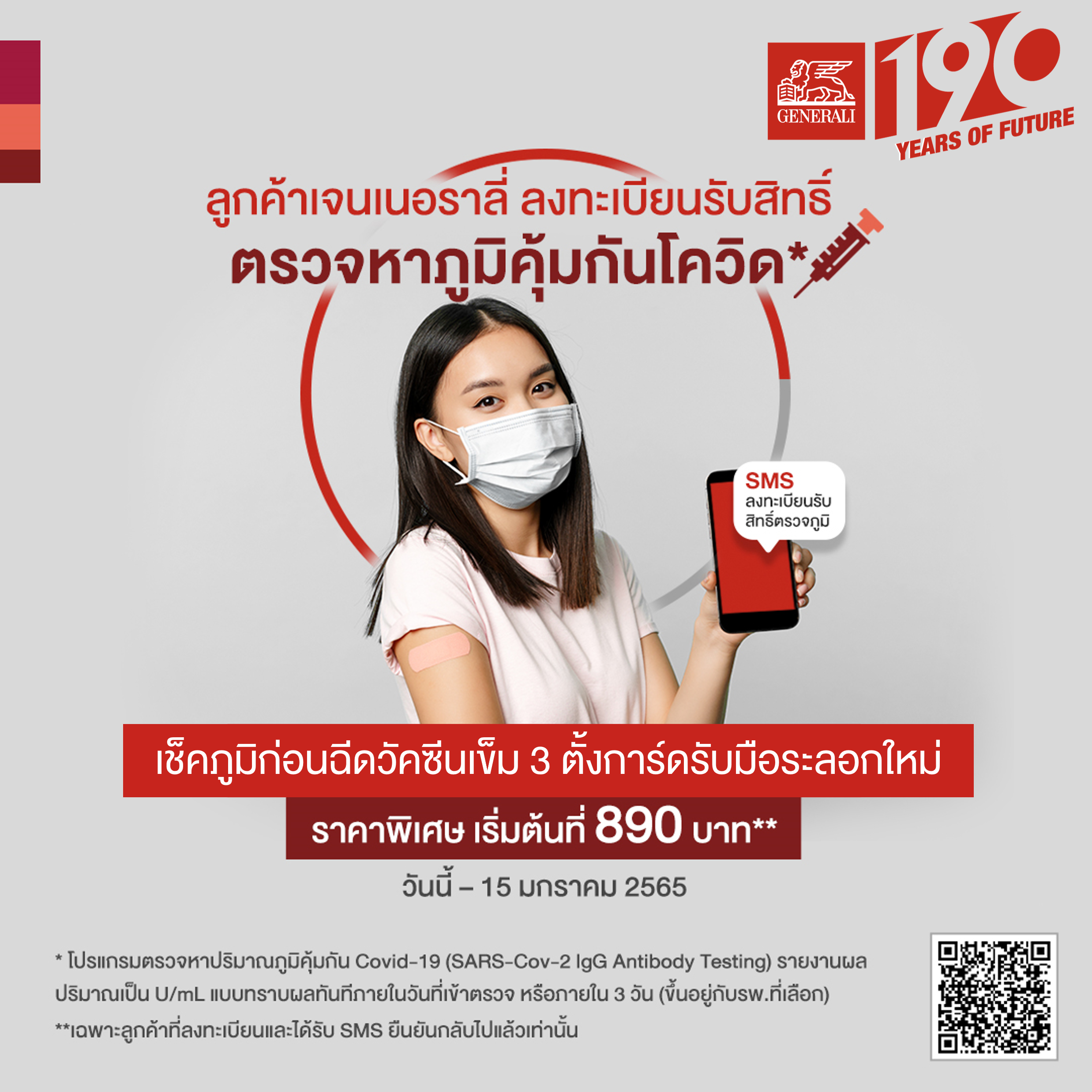 สำหรับลูกค้าที่ฉีดวัคซีนแล้ว แต่ยังมีความกังวลใจ สามารถรับสิทธิพิเศษลงทะเบียนจองโปรแกรมตรวจหาปริมาณภูมิคุ้มกันโควิด-19 ในราคาพิเศษจากโรงพยาบาลในเครือข่ายเจนเนอราลี่ ไทยแลนด์ที่ร่วมรายการ ผ่าน LINE Official @Generalithailand ตั้งแต่วันนี้จนถึงวันที่ 15 มกราคม และสามารถใช้สิทธิได้ถึง 31 มกราคม 2565