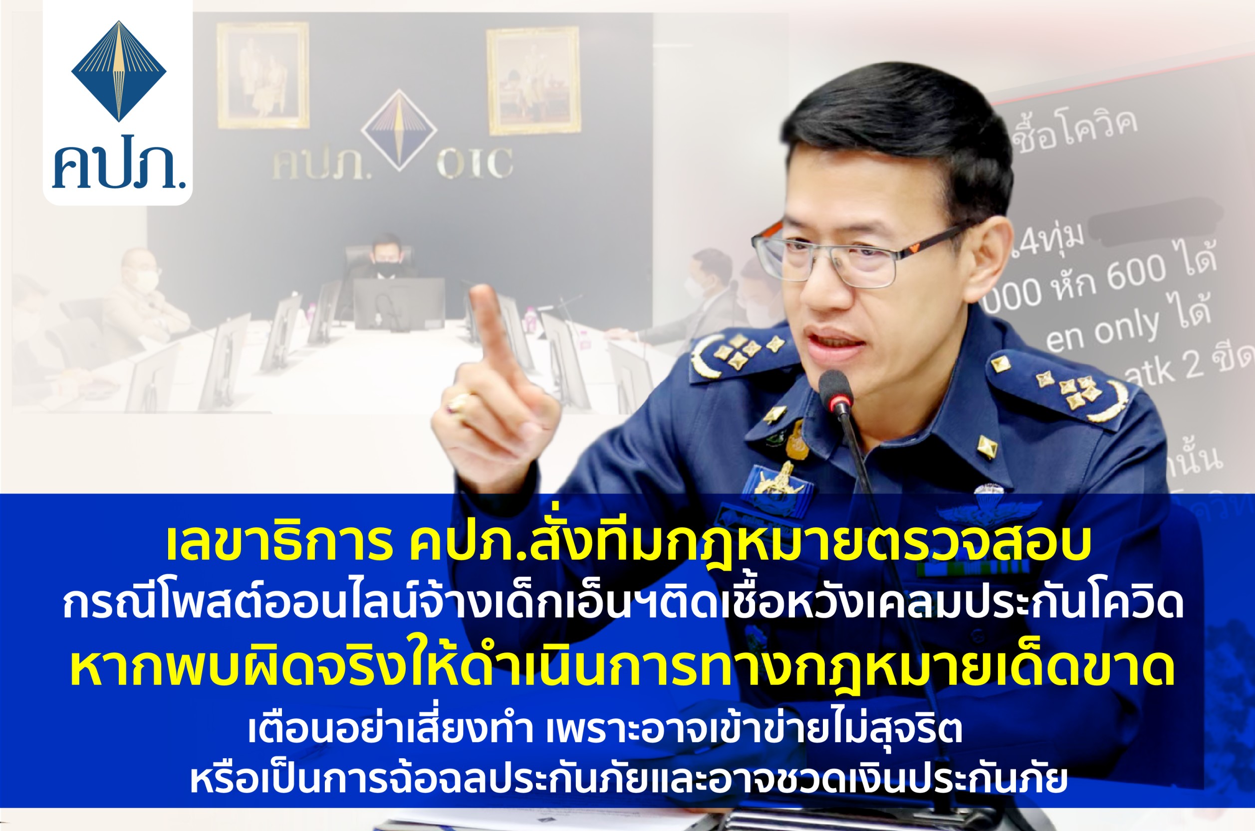 สำนักงาน คปภ. ไม่ได้นิ่งนอนใจได้ส่งทีมสายกฎหมายและคดีเข้าตรวจสอบข้อเท็จจริงและพบตัวผู้โพสต์ข้อความดังกล่าวแล้ว ซึ่งจากการตรวจสอบพบว่าผู้โพสต์ดังกล่าวได้มีการเอาประกันภัยโควิด (covid-19) กับบริษัทแห่งหนึ่งด้วย ทั้งนี้สำนักงาน คปภ. จะเร่งตรวจสอบและหากพบการกระทำความผิดจะดำเนินการตามกฎหมายต่อไป