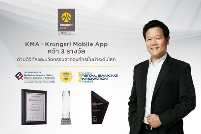 กรุงเทพฯ, 13 มกราคม 2565 : นายสยาม ประสิทธิศิริกุล ประธานกลุ่มสนับสนุนธุรกิจด้านเทคโนโลยีสารสนเทศและดิจิทัล ธนาคารกรุงศรีอยุธยา รับ 3 รางวัล จากความสำเร็จของ KMA – Krungsri Mobile App ตอกย้ำความมุ่งมั่นของกรุงศรีในการประยุกต์ใช้เทคโนโลยีเพื่อสร้างสรรค์นวัตกรรมและขับเคลื่อนธุรกิจ โดยรางวัลที่ได้รับ ประกอบด้วย