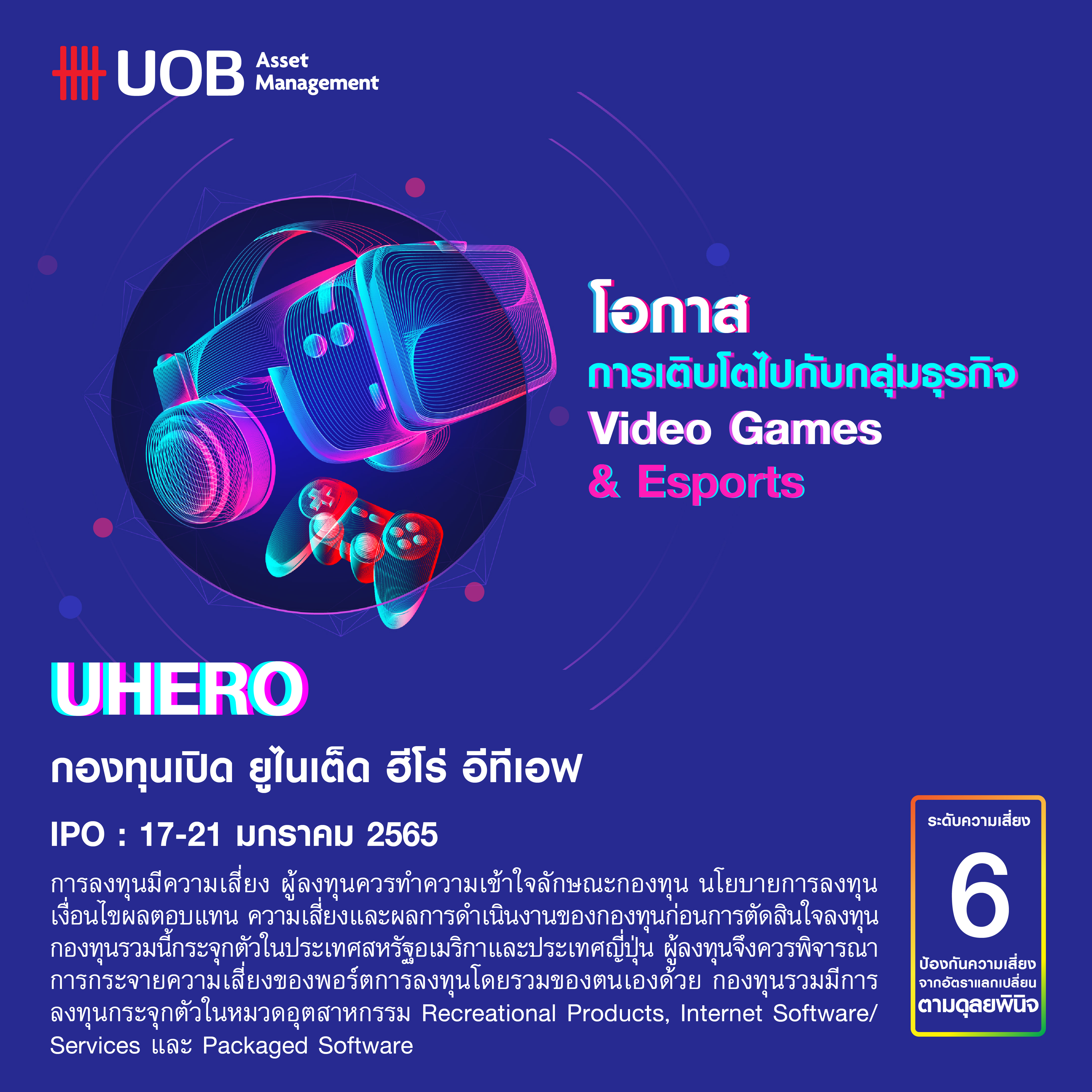 กองทุนเปิด ยูไนเต็ด ฮีโร่ อีทีเอฟ (UHERO) ระดับความเสี่ยงกองทุน 6 เน้นลงทุนในกองทุนรวมต่างประเทศ Global X Video Games & Esports ETF (กองทุนหลัก) ซึ่งจะไปลงทุนตามดัชนี Solactive Video Games & E-sports Index ซึ่งดัชนีจะประกอบด้วย 30-40 บริษัทที่มีรายได้มาจากธุรกิจที่เกี่ยวเนื่องกับเกมและอีสปอร์ต โดยมีทั้งผู้ผลิต Software Hardware ผู้จัดจำหน่าย ไปจนถึงบริการการถ่ายทอดสดทั้งภาพและเสียงโดยใช้เครือข่ายระบบอินเตอร์เน็ต (Live Streaming) หรือจัดแข่งขันอีสปอร์ต เป็นต้น