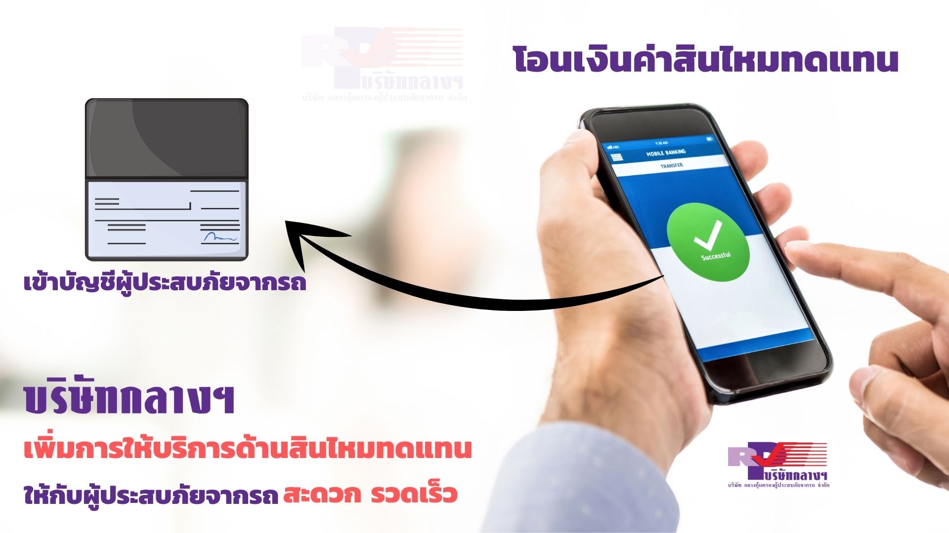 เมื่อทางบริษัทได้รับเอกสารประกอบการเบิกถูกต้อง ครบถ้วนแล้วจะดำเนินการโอนเงินค่าสินไหมทดแทนให้กับผู้ประสบภัยหรือทายาทภายใน 7 วัน โดยจะส่ง SMSแจ้งวันที่โอนเงินให้ผู้ประสบภัยจากรถ ทราบล่วงหน้าก่อนหนึ่งวันผู้ประสบภัยสามารถติดต่อสอบถามการใช้สิทธิตามประกันภัย พ.ร.บ.ได้ที่ Call Center บริษัทกลางคุ้มครองผู้ประสบภัยจากรถ จำกัด 1791 ตลอด 24 ชั่วโมง หรือที่ www.rvp.co.th ![]()