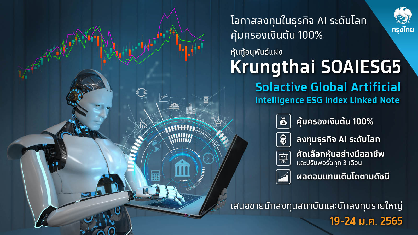 สำหรับหุ้นกู้อนุพันธ์แฝงรุ่นที่ 3 หุ้นกู้อนุพันธ์แฝง Krungthai Solactive Global Artificial Intelligence ESG (SOAIESG5) อายุ 5 ปี ธนาคารยังคงชูจุดเด่น คุ้มครองเงินต้นให้ลูกค้า 100% โดยจ่ายผลตอบแทนอิงกับดัชนี SOAIESG5 (Solactive Global Artificial Intelligence ESG) ที่จะเข้าลงทุนในธุรกิจที่เกี่ยวข้องกับปัญญาประดิษฐ์ หรือ Artificial Intelligence (AI) ยักษ์ใหญ่ทั่วโลก ทั้ง Hardware และ Software อาทิ Meta หรือ Facebook เดิม Alphabet บริษัทแม่ของ Google Tencent Alibaba NVIDIA Pure Storage Intel Zoom eBay Twitter เป็นต้น