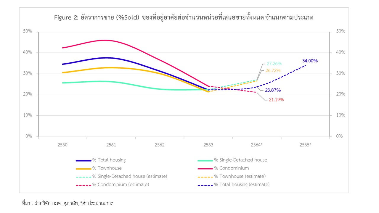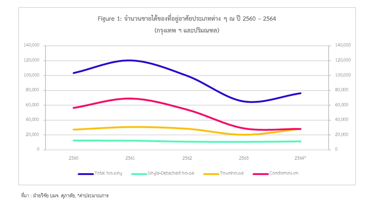 การบังคับใช้มาตรการป้องกันสถานการณ์การแพร่ระบาดจากภาครัฐ การปิดห้างร้านและจำกัดกิจกรรมทางเศรษฐกิจหลายประเภทโดยเฉพาะในกลุ่มธุรกิจท่องเที่ยวและที่เกี่ยวเนื่อง เป็นสาเหตุหลักที่ทำให้ในปี 2564 อุปสงค์โดยรวมในตลาดที่อยู่อาศัยยังไม่กลับเข้ามาในตลาด การปรับตัวของผู้ประกอบการที่ต่างชะลอการเปิดตัวสินค้าใหม่อย่างต่อเนื่องในห้วงสองปีที่ผ่านมา จึงทำให้อุปทานในตลาดเพิ่มขึ้นเพียงเล็กน้อย คาดการณ์ว่ายอดขายที่อยู่อาศัยรวมในปี 2564 น่าจะอยู่ในระดับที่ประมาณ 76,000 หน่วย
