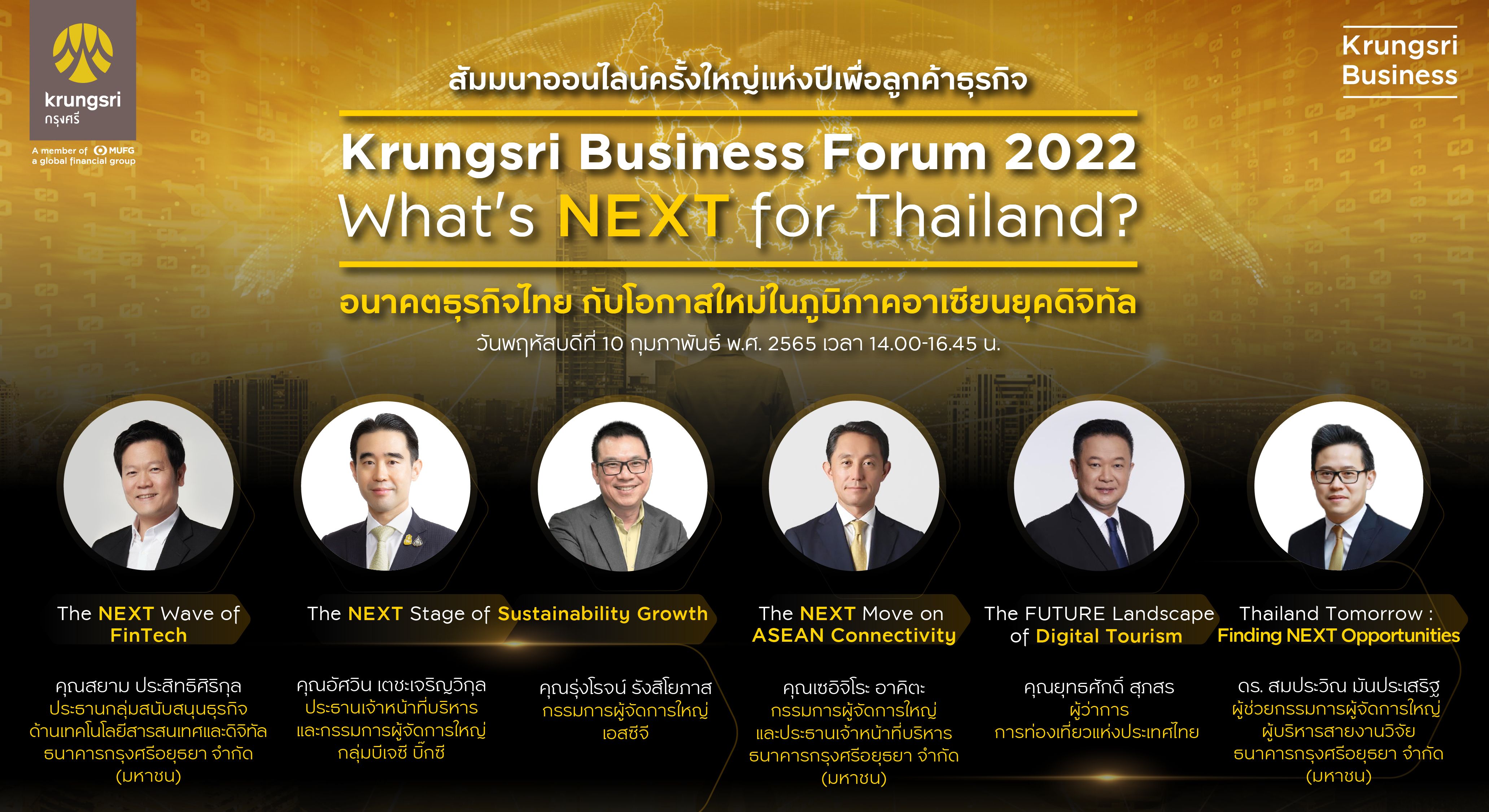 กรุงเทพฯ, 18 มกราคม 2565 : กรุงศรี (ธนาคารกรุงศรีอยุธยา จำกัด (มหาชน)) ขอเชิญลูกค้าธุรกิจเข้าร่วมงานสัมมนาออนไลน์ครั้งใหญ่แห่งปี Krungsri Business Forum 2022 : What’s Next for Thailand? ภายใต้หัวข้อ อนาคตธุรกิจไทย กับโอกาสใหม่ในภูมิภาคอาเซียนยุคดิจิทัล ในวันพฤหัสที่ 10 กุมภาพันธ์ 2565 เวลา 14.00 – 16.45 น.