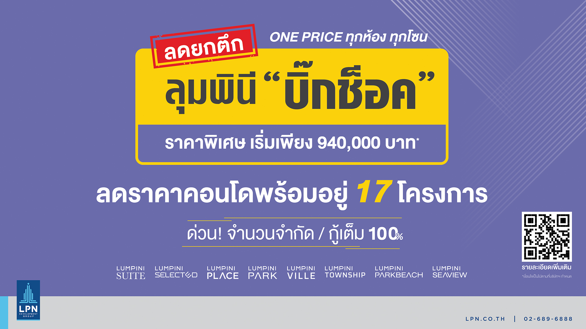 ทั้งนี้ เพื่อสนับสนุนมาตรการกระตุ้นอสังหาฯของภาครัฐ นางปนัดดา กล่าวว่า LPN ได้เปิดตัวแคมเปญ ลุมพินี “บิ๊กช็อค ลดยกตึก ขายราคาเดียว” เพื่อเพิ่มโอกาสในการซื้อบ้านให้กับคนไทย โดยนำ 17 โครงการ คอนโดมิเนียมพร้อมอยู่ 3,700 ยูนิต มูลค่ารวม 7,000 ล้านบาท มามอบส่วนลดสูงสุดถึง 2.44 ล้านบาท โดยราคาเริ่มต้นที่ 940,000 บาท ในทุกทำเลทั่วกรุงเทพฯ พัทยา ชะอำ และอุดรธานี และลูกค้าที่จองและทำสัญญา สามารถลุ้นรับส่วนลดพิเศษเพิ่ม มีมูลค่าสูงสุด 100,000 บาท เริ่มตั้งแต่วันนี้ ถึง 28 ก.พ.2565