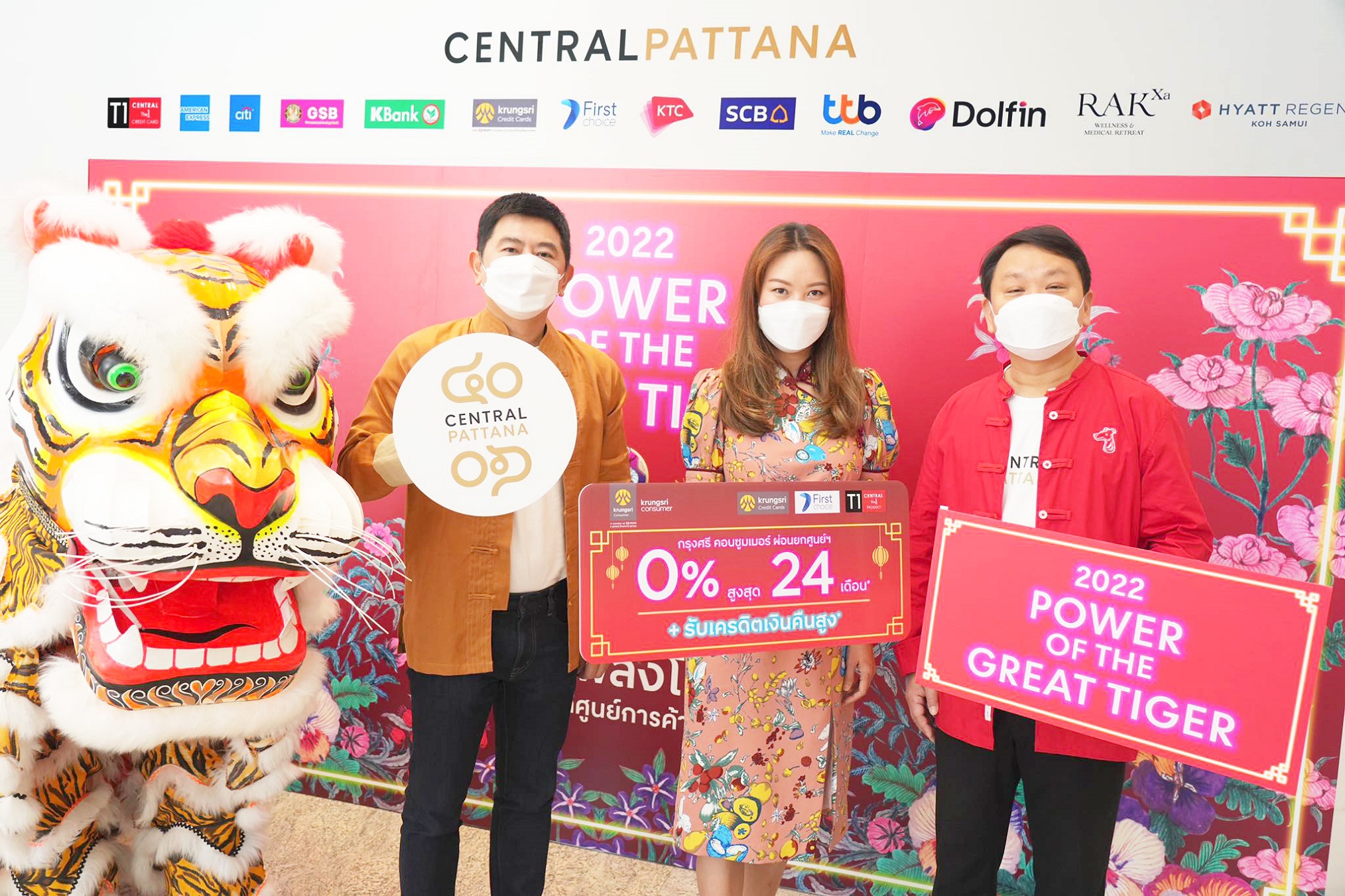 กรุงเทพฯ, 25 มกราคม 2565 : กรุงศรี คอนซูมเมอร์ นำโดย กาญจนี พฤกษานุวงศ์ (กลาง) ผู้อำนวยการฝ่ายการตลาด บริษัท อยุธยาแคปปิตอล เซอร์วิสเซส จำกัด ตัวแทนบัตรเครดิตและบัตรผ่อนชำระในเครือกรุงศรี คอนซูมเมอร์ ร่วมกับ เซ็นทรัลพัฒนา นำโดย ดร.ณัฐกิตติ์ ตั้งพูลสินธนา (ขวา) ผู้ช่วยกรรมการผู้จัดการใหญ่ สายงานการตลาด และ กันตภณ ผาณิตรัตน์ (ซ้าย) ผู้อำนวยการอาวุโสกลุ่มงานการตลาดสาขาและบริหารงานลูกค้า บริษัท เซ็นทรัลพัฒนา จำกัด (มหาชน) ฉลองเทศกาลตรุษจีน จัดโปรโมชัน “2022 POWER OF THE GREAT TIGER” ตั้งแต่ 17 มกราคม – 28 กุมภาพันธ์ 2565
