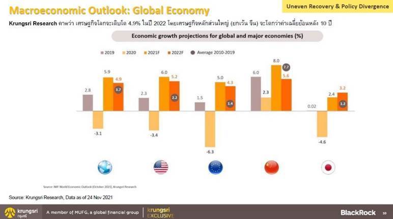 วิจัยกรุงศรีคาดการณ์ภาพรวมเศรษฐกิจโลกในปี 2565 จะเติบโตอยู่ที่ 4.9% พร้อมให้ข้อมูลค่าเฉลี่ยย้อนหลัง 10 ปี ซึ่งช่วยฉายภาพให้เห็นถึงสถานการณ์เศรษฐกิจโลกและนโยบายทางเศรษฐกิจที่แตกต่างกันในแต่ละประเทศได้ชัดเจนขึ้น