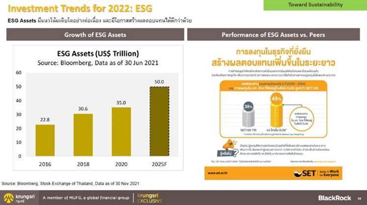 หากดูตัวเลขสินทรัพย์ ESG (ESG Asset) ทาง Bloomberg คาดการณ์ไว้ว่าภาพรวมสินทรัพย์ ESG อยู่ที่ระดับประมาณ 35 ล้านล้านดอลลาร์สหรัฐฯ ในปี 2564 ที่ผ่านมา และคาดว่าภายในปี 2568 จะเติบโตขึ้น อยู่ที่ 50 ล้านล้านดอลลาร์สหรัฐฯ หรือคิดเป็น 1 ใน 3 ของสินทรัพย์การลงทุนทั่วโลก ซึ่งรวมทั้งหุ้น ตราสารหนี้ และสินทรัพย์อื่นๆ สะท้อนให้เห็นว่าการลงทุนใน ESG ไม่ใช่แค่หุ้น แต่มีกระจายไปยังสินทรัพย์อื่นๆ ด้วย และตัวเลขดังกล่าวยังบ่งบอกว่าจะมีเม็ดเงินไหลเข้าสินทรัพย์ ESG อย่างต่อเนื่องและมากขึ้น ทั้งจากนักลงทุนสถาบันและรายย่อย โดยเฉพาะนักลงทุนสถาบันทั้งในยุโรปและสหรัฐฯ