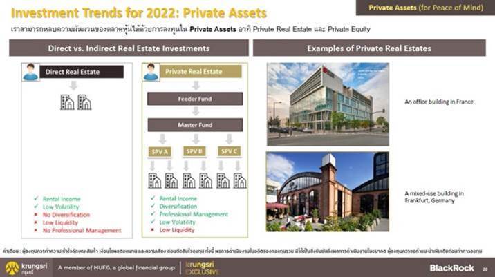 คุณวิน อธิบายเพิ่มเติมว่า ลักษณะคล้ายการที่นักลงทุนลงทุนในคอนโดให้เช่า แต่การลงทุนอสังหาริมทรัพย์ อาจมีความกังวลเรื่องผู้เช่า การดูแลรักษา รวมทั้งสภาพคล่องที่ต่ำมาก นักลงทุนอาจไม่มีโอกาสกระจายความเสี่ยง แต่หากเราสามารถเลือกลงทุนในลักษณะเดียวกัน แต่เป็นกองทุนซึ่งเป็นอสังหาริมทรัพย์นอกตลาด โดยให้ผู้จัดการกองทุนเป็นผู้จัดการให้ทั้งหมด ไม่ว่าจะเป็นการเลือกสินทรัพย์ในต่างประเทศที่มีความหลากหลาย ทั้งที่เป็นอาคาร Mix-used หรืออพาร์ทเมนต์ มีคนบริหารจัดการให้ ดูแลเรื่องภาษี ซึ่งตัวเลขคาดการณ์ผลตอบแทนที่เราคาดหวังจะอยู่ที่ประมาณ 4-5%