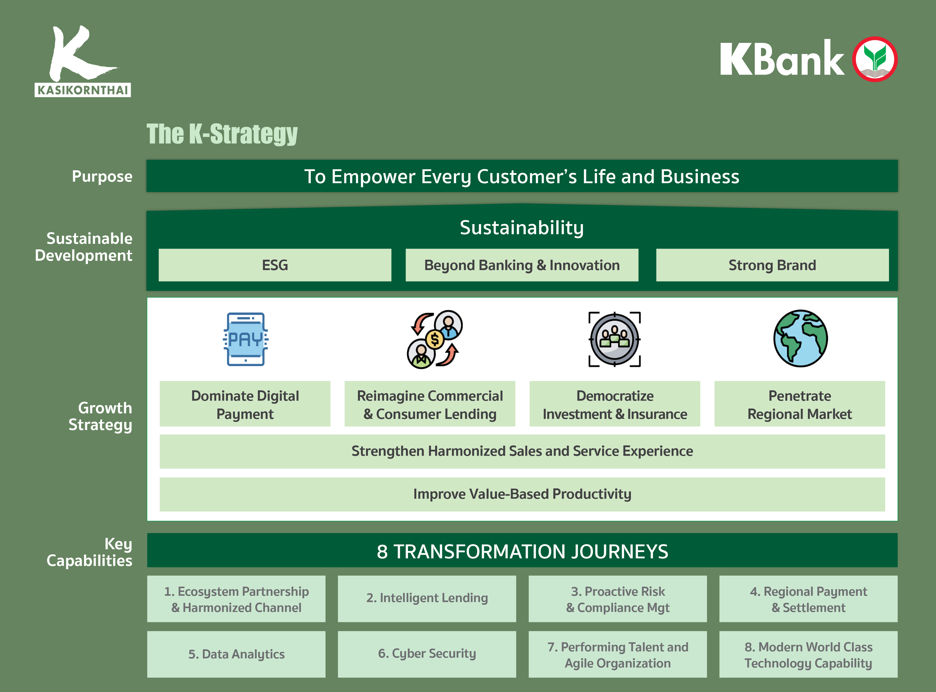 (1) การร่วมมือกับพันธมิตรทางธุรกิจในการสร้าง Ecosystem ควบคู่กับการพัฒนาช่องทางการขายและให้บริการของธนาคาร เพื่อส่งมอบประสบการณ์ที่ดีที่สุดให้กับลูกค้า (Ecosystem Partnership & Harmonized Channel) (2) การวิเคราะห์ข้อมูลเพื่อเสนอสินเชื่อให้ตรงกับความต้องการของลูกค้าแต่ละราย (Intelligent Lending) (3) การบริหารความเสี่ยงด้านต่าง ๆ และแนวทางการป้องกันในเชิงรุก (Proactive Risk & Compliance Management) (4) การพัฒนาบริการรับชำระเงินระหว่างประเทศ (Regional Payment & Settlement)