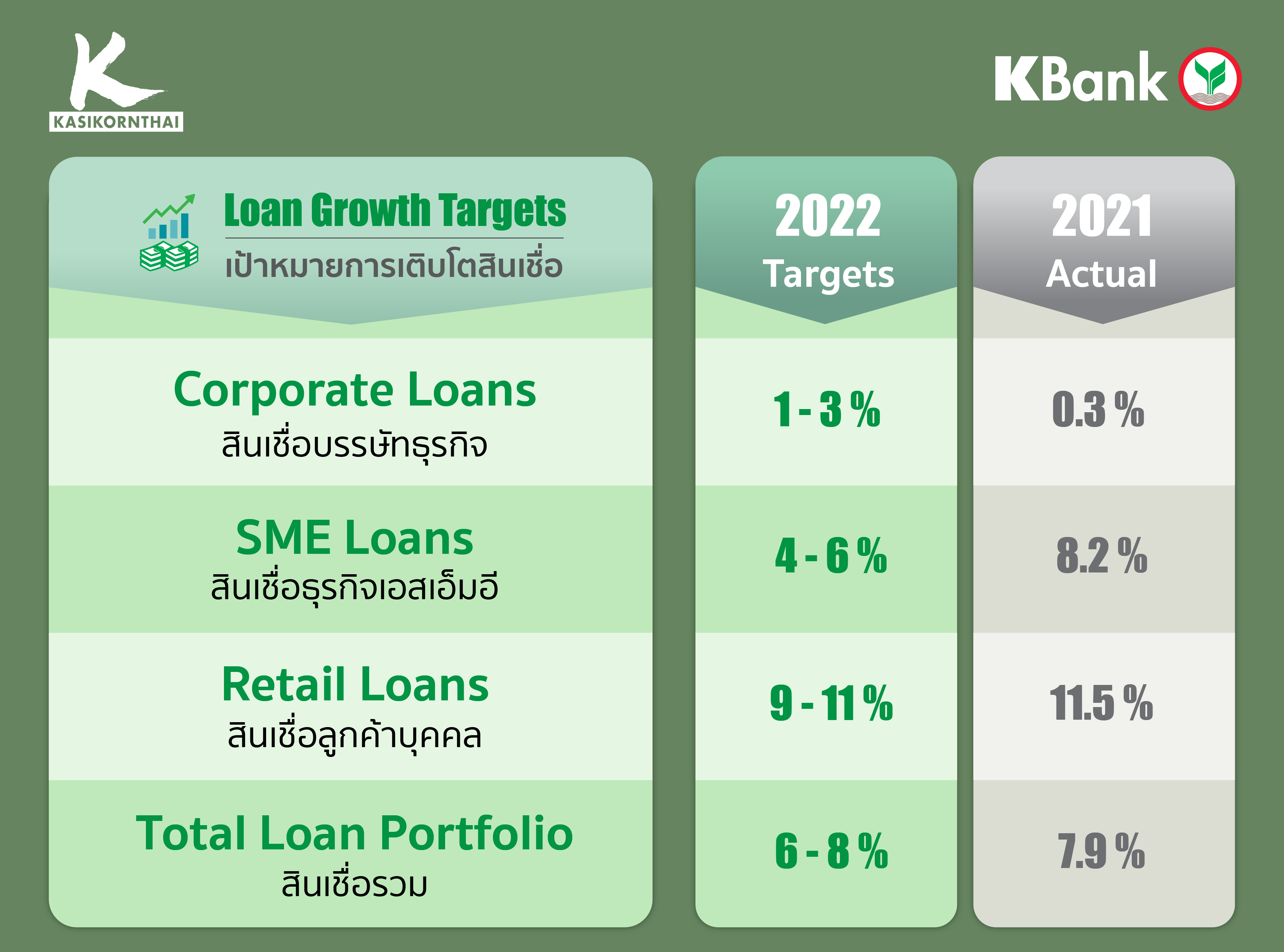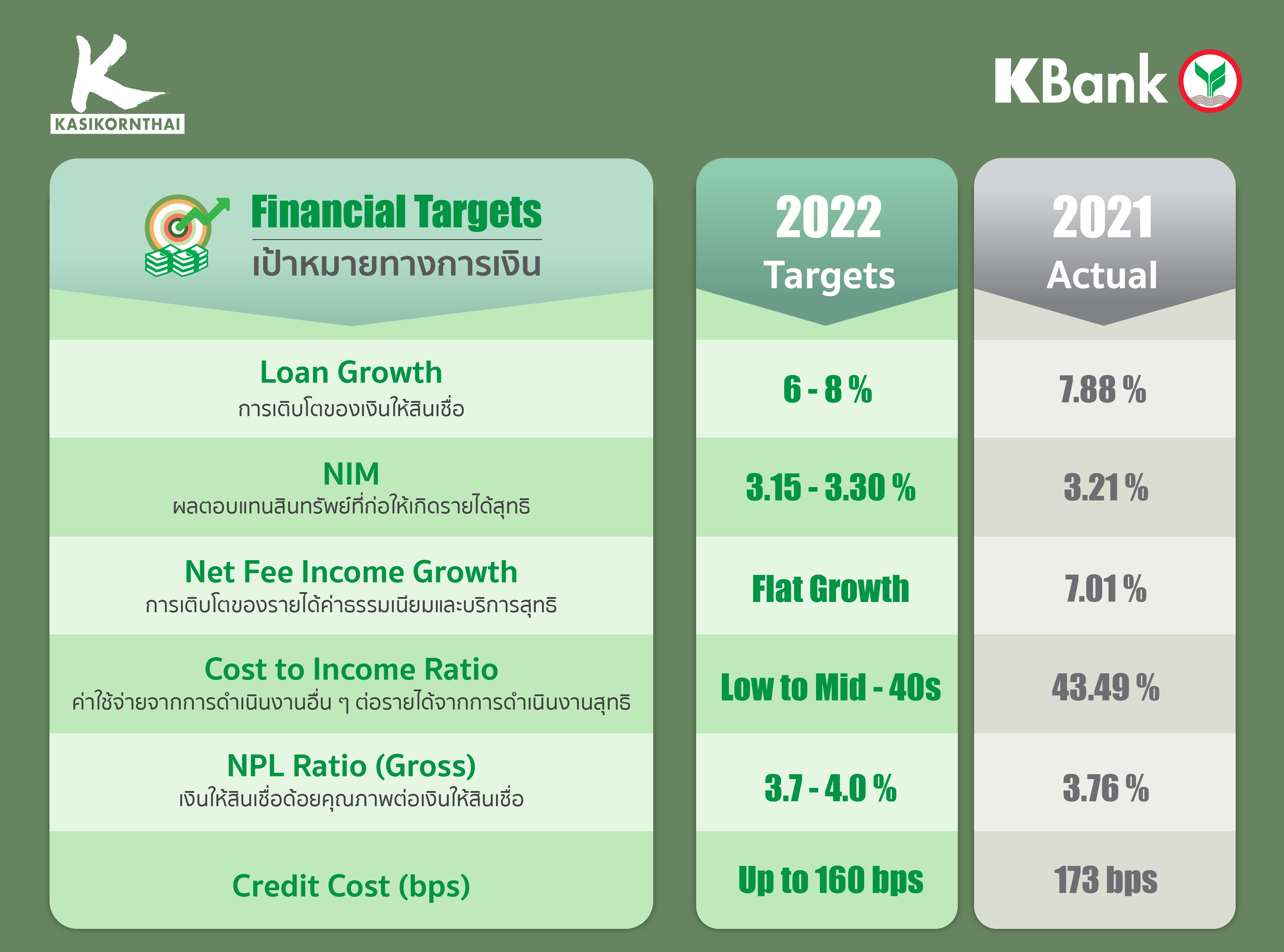 ธนาคารกสิกรไทยได้ประกาศเป้าหมายทางการเงินปี 2565 ดังนี้