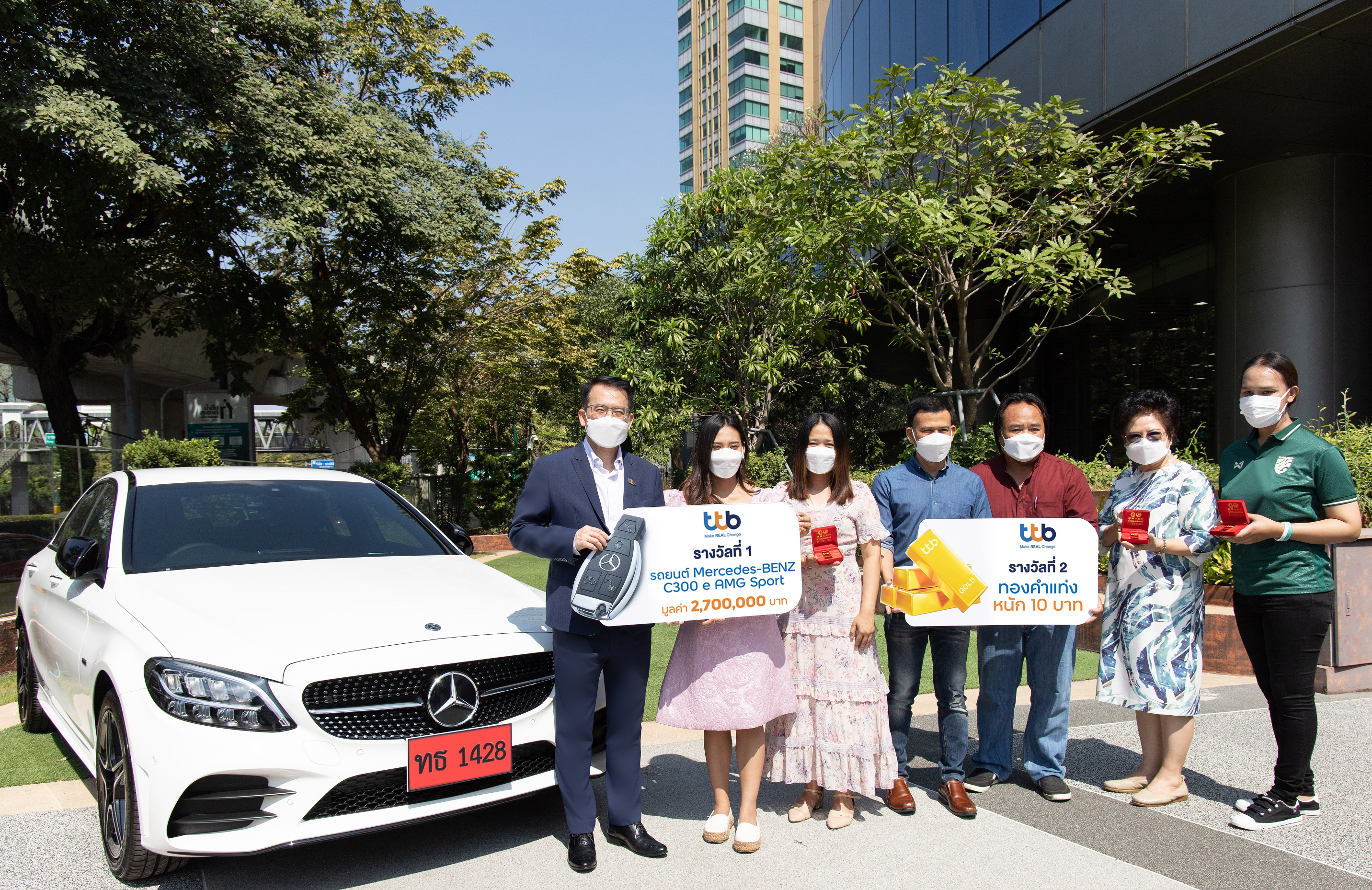 31 มกราคม 2565 : ทีเอ็มบีธนชาต หรือ ทีทีบี (ttb) โดย อนุวัติร์ เหลืองทวีกุล ประธานเจ้าหน้าที่บริหารลูกค้าบุคคล (ที่ 1 จากซ้าย) ร่วมมอบรางวัลใหญ่แก่ผู้โชคดีจากการซื้อสลากบำรุงกาชาดไทย ประจำปี 2564 โดยผู้โชคดีที่ได้รับรถยนต์เมอร์เซเดส-เบนซ์ C300 ได้แก่ วรดา แย้มบู่ และผู้โชคดีที่ได้รับรางวัลทองคำแท่ง หนัก 10 บาท 5 รางวัล ได้แก่ สุรีรัตน์ ทรัพย์ไพ, สัจจา นุ่นมัน, อิทธิรักษ์ แดงแจ้, ธัญญพัทธ์ ภิรมย์เลิศโสภา และ ณภัทร อัมพันศิริรัตน์ นอกจากนี้ ธนาคารยังได้มอบรางวัลจากสลากบำรุงกาชาดไทยให้กับผู้โชคดีท่านอื่น ๆ รวมทั้งสิ้น 351 รางวัล อาทิ สร้อยคอทองคำ 1 บาท, สร้อยคอทองคำ 50 สตางค์ และ สร้อยคอทองคำ 25 สตางค์ มูลค่ารางวัลรวมกว่า 8.2 ล้านบาท ณ ทีทีบี สำนักงานใหญ่ เมื่อเร็วๆ นี้ ![]()