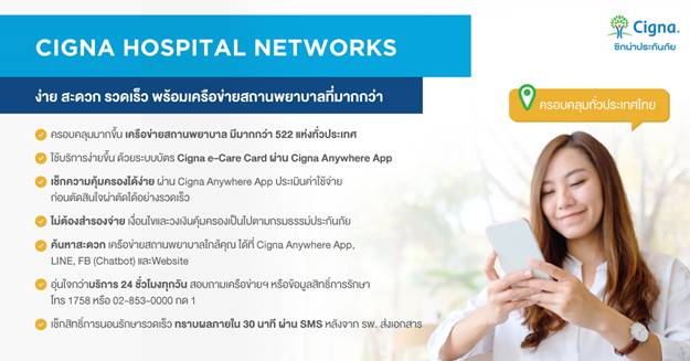 ค้นหาสถานพยาบาลในเครือข่าย Cigna ใกล้คุณได้ที่ Cigna Anywhere Mobile app, LINE, FB (Chatbot) และWebsite” ติดต่อสอบถามข้อมูลเพิ่มเติมได้ที่ศูนย์บริการลูกค้าซิกน่า โทร 1758 หรือ 02-853-0000 ![]()