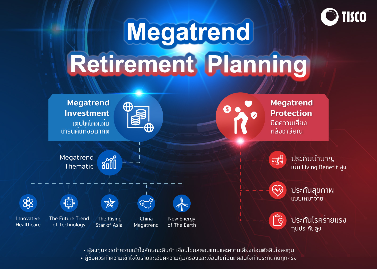 จากประเด็นดังกล่าว ธนาคารทิสโก้ เล็งเห็นว่า “แผนการเงินเพื่อการเกษียณ” ของลูกค้าจำเป็นจะต้อง “ปรับเปลี่ยน” เพื่อให้เพียงพอต่อการใช้ชีวิตหลังเกษียณที่มีคุณภาพตลอดช่วงอายุ จึงได้ยกระดับคำแนะนำการวางแผนเกษียณภายใต้คอนเซ็ปต์ “Megatrend Retirement Planning” ซึ่งเป็นการวางแผนที่เท่าทันกระแสการเปลี่ยนแปลงของโลก (Megatrends) โดยสร้างเงินก้อนก่อนเกษียณให้เป็นไปตามเป้าหมาย ด้วยกองทุนคุณภาพที่เน้นลงทุนในธุรกิจแห่งอนาคต (Megatrend Investment) และปกป้องความเสี่ยงหลังเกษียณที่สอดรับกับกระแสโลก (Megatrend Protection) ด้วยประกันบำนาญที่มีผลประโยชน์ในขณะดำรงชีวิต (Living Benefit) สูง ประกันสุขภาพแบบเหมาจ่าย และประกันโรคร้ายแรงที่มีทุนประกันสูง