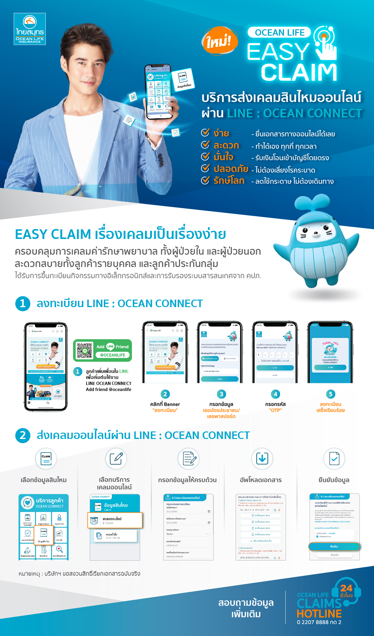 ดังนั้น OCEAN LIFE ไทยสมุทร จึงได้ส่งนวัตกรรมการบริการใหม่ล่าสุด! OCEAN LIFE EASY CLAIM บริการเคลมสินไหมออนไลน์ผ่าน LINE : @Oceanlife เชื่อมต่อ OCEAN CONNECT ที่ช่วยให้เรื่องเคลมเป็นเรื่องง่าย แบ่งเบาภาระของลูกค้าในยามเจ็บป่วยหากจำเป็นต้องเข้ารักษาตัวในโรงพยาบาล และต้องสำรองจ่ายค่ารักษาพยาบาล โดยครอบคลุมการเคลมค่ารักษาพยาบาลจากการเจ็บป่วยหรืออุบัติเหตุ สำหรับผู้ป่วยใน (IPD) และผู้ป่วยนอก(OPD) และกรณีสินไหมค่าชดเชยรายได้รายวันทั้งลูกค้ารายบุคคล และลูกค้าประกันกลุ่มลูกค้า ซึ่งลูกค้าสามารถส่งเคลมสินไหมออนไลน์ได้ง่าย ๆ จากทุกที่ทุกเวลาตลอด 24 ชั่วโมงผ่าน LINE : OCEAN CONNECT