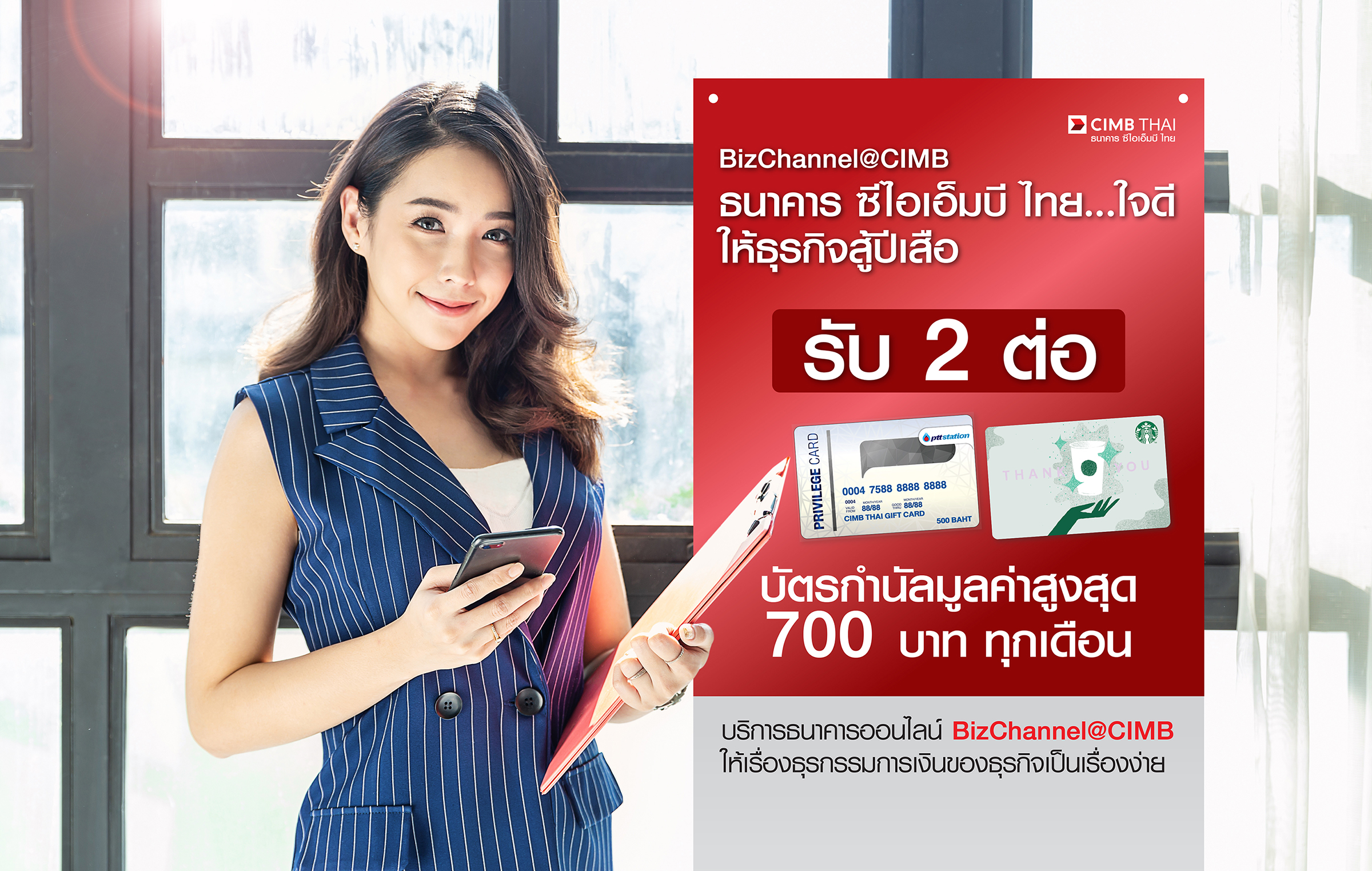 ธนาคารจึงอยากเชิญชวนลูกค้าธุรกิจมาลองใช้บริการและขอส่งมอบโปรโมชั่นดีๆ ต้อนรับปีเสือ ต่อที่ 1 ลูกค้าที่สมัครและทำธุรกรรมผ่าน BizChannel@CIMB จำนวน 4รายการขึ้นไปต่อเดือน รับบัตรเติมน้ำมัน PTT Privilege card มูลค่า 500บาท ต่อที่ 2 ลูกค้าที่อนุมัติธุรกรรมผ่าน BizChannel@CIMB Mobile Appจำนวน 1 รายการขึ้นไปต่อเดือน รับเพิ่ม STARBUCKS CARD มูลค่า 200บาท รวมมูลค่าที่ลูกค้าจะได้รับสูงสุด 700 บาททุกเดือน ตั้งแต่วันที่ 1กุมภาพันธ์ ถึง 30 เมษายน 2565 ![]()