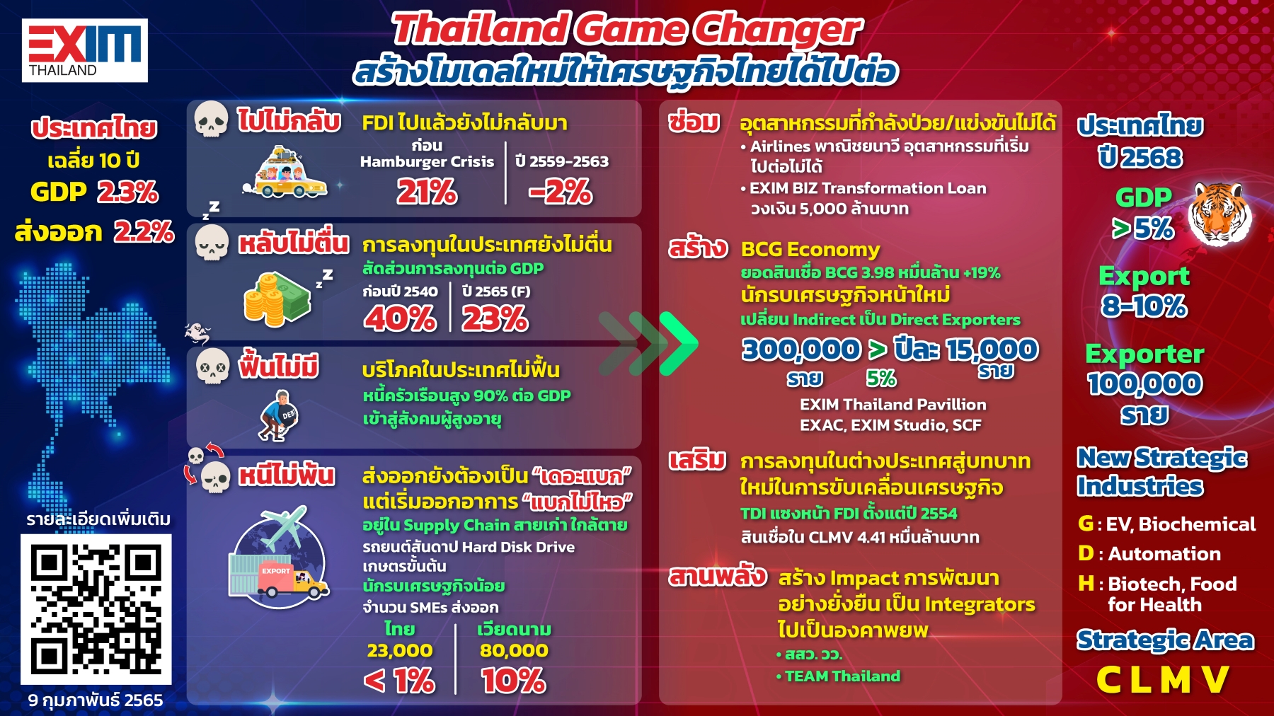 ดร.รักษ์ กล่าวว่า EXIM BANK ในฐานะธนาคารเพื่อการพัฒนาแห่งประเทศไทยจึงขอเสนอกลยุทธ์ “เกมเปลี่ยนประเทศไทย (Thailand Game Changer)” ดังนี้