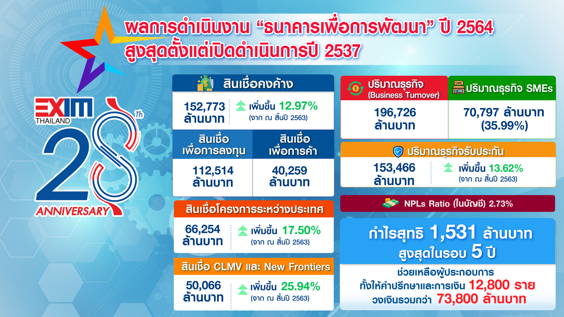 โดยปี 2564 มีสินเชื่อคงค้างจำนวน 50,066 ล้านบาท เพิ่มขึ้น 10,312 ล้านบาทหรือ 25.94% เมื่อเทียบกับปีก่อน สะท้อนให้เห็นถึงความมุ่งมั่นในการสนับสนุนผู้ประกอบการไทยให้รุกตลาด New Frontiers รวมถึง CLMV ซึ่งมีโอกาสทางธุรกิจและอัตราการเติบโตทางเศรษฐกิจสูง