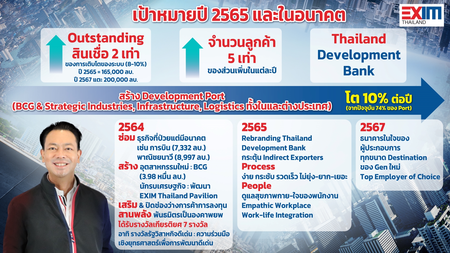 กรรมการผู้จัดการ EXIM BANK กล่าวว่า ในการเดินหน้าภารกิจข้างต้น พื้นฐานสำคัญคือ คน (People) ซึ่ง EXIM BANK จะเร่งพัฒนาองค์กรให้เป็น Empathic Workplace ที่ดึงดูดให้บุคลากรภายในองค์กรพร้อมส่งมอบผลลัพธ์ที่ดีไปสู่ลูกค้า ผู้ประกอบการ โดยเฉพาะ SMEs และผู้คนในสังคมที่ยังเปราะบาง ให้เข้มแข็ง มีศักยภาพ และยืดหยุ่น