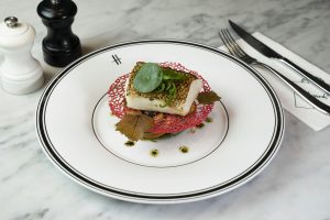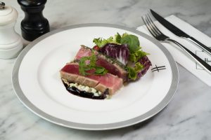 ตามด้วย ‘Pork Belly’ (680 บาท) เนื้อหมูสามชั้นที่ฟังแล้วเหมือนจะธรรมดาแต่ไม่ธรรมดา เพราะเชฟได้นำไปผ่านกรรมวิธีการตุ๋นและปรุงรสชาติด้วยสูตรพิเศษเฉพาะ Harrods Thailand เสิร์ฟพร้อมเครื่องเคียงหลากหลายชนิดที่นำมาตกแต่งอย่างพิถีพิถัน ตามคอนเซปต์เซอร์ไพรส์ขอคู่รักแต่งงาน ก่อนถึงคิวของ ‘Seared Tuna with apple salsa and herb mustard sauce’